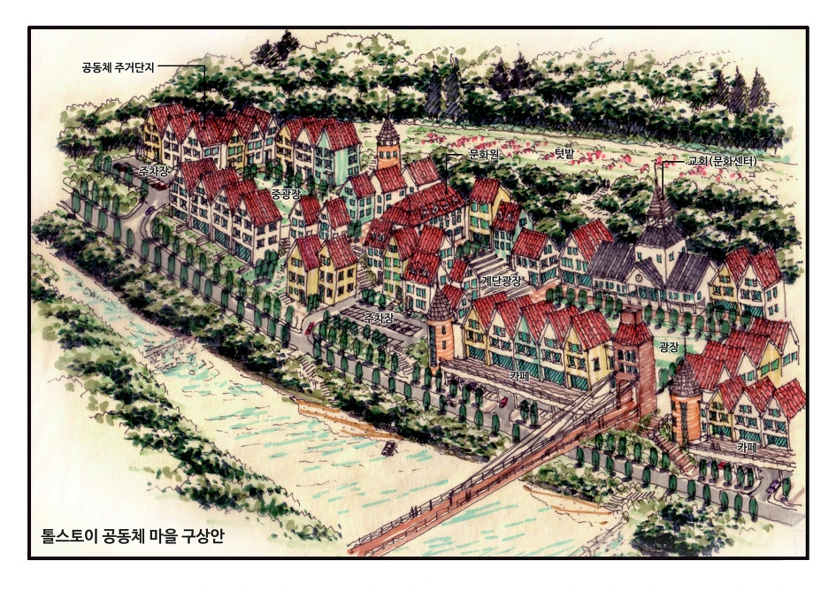 나는 내가 살고 있는 지역에서 오랜기간동안 예술인 마을 등 이상적인 마을을 만들어보려고 갖가지 그림을 그려가며 능력있는 사람들을 설득해 오고 있는 중이다(아직도 그림만 그리고 있음). 이러한 나의 활동사항을 알고 있는 이 친구가 지난 해 말 좋은 여건이 조성되고 있는 중이니 나에게 자신이 꿈꾸는 이상적인 공동체 마을을 그림으로 표현해 달라는 부탁을 받았다. 경기도 양주에 큰 땅을 가지고 있는 사람이 있는데 이 사람이 자신의 땅 일부분을 예술가들이나 공동체를 희망하는 사람들에게 무상또는 저렴한 가격에 분양을 한다는 것이었다. 친구는 같은 교회 교인들을 중심으로 본인과 뜻을 같이 하는 사람들이 모여 그곳에다 톨스토이를 주제로 하는 이상적인 공동체 마을을 만들어 보자는 제안을 해 왔다. 땅 소유자의 논리는 이러했다. 아직까지 접근성이 양호하지 못한 큰 땅을 사서 예술가들이나 동호인들이 활동적인 활동을 하게 되면 자연스레 지가가 상승하니 무상 또는 저렴한 가격에 땅을 분양하더라도 이미지도 좋아지고 다른 땅에서 충분한 보상을 받을 수 있을 것이라는 것이었다. 친구와 나는 그 사람에게 정말 현명한 판단을 한 것이라 박수를 보내며 좋은 후보지 물색에 나섰다. 그런데 그 사람은 싼 땅을 찾느라 너무 접근성이 떨어진 곳만을 찾고 있어서 예술가들이나 공동체 구성원들이 선뜻 나서기가 쉽지 않을 듯 했다.