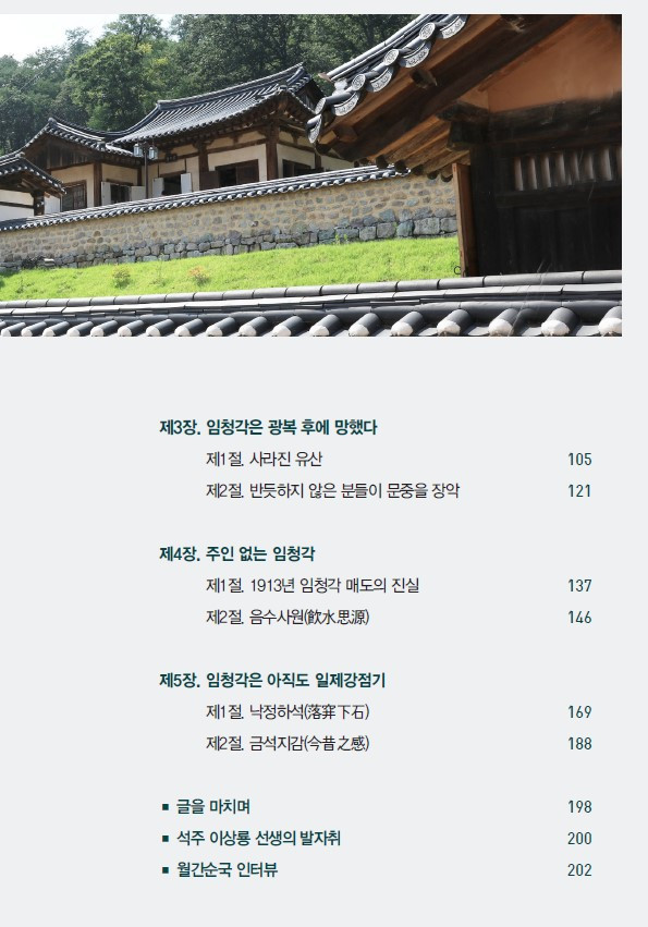국가 차원에서 역사적인 건축물을 복원하는 것은 매우 바람직한 일이긴 하나 독립운동에 모든 것을 바쳤던 석주 이상룡 선생을 비롯한 많은 독립운동가를 배출하였던 임청각 후손들에 대한 서훈과 보상이 제대로 이루어지고 있지 않는데 대한 많은 억울함과 서운함이 배어나오는 책이다.