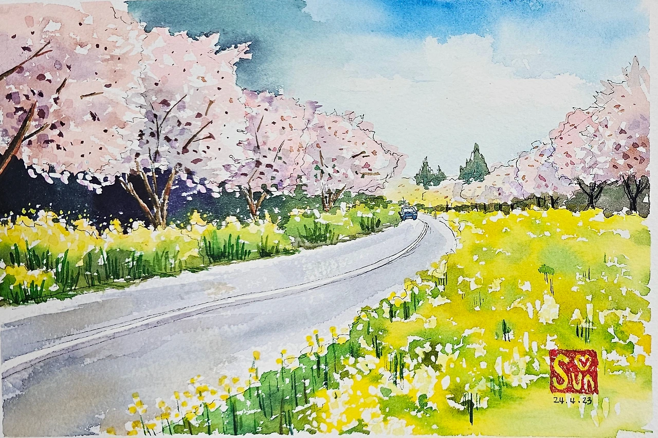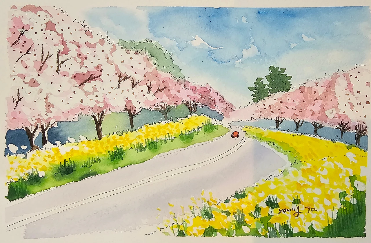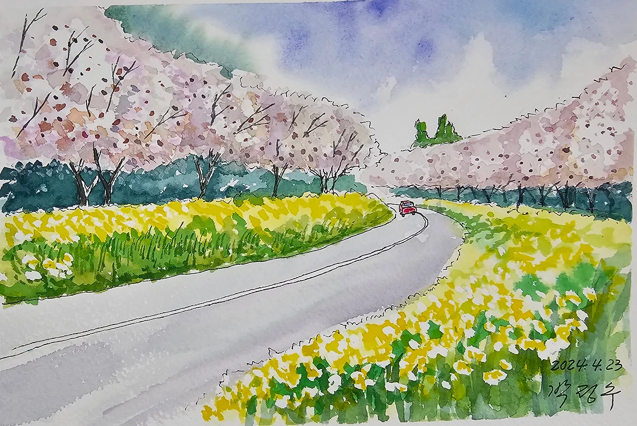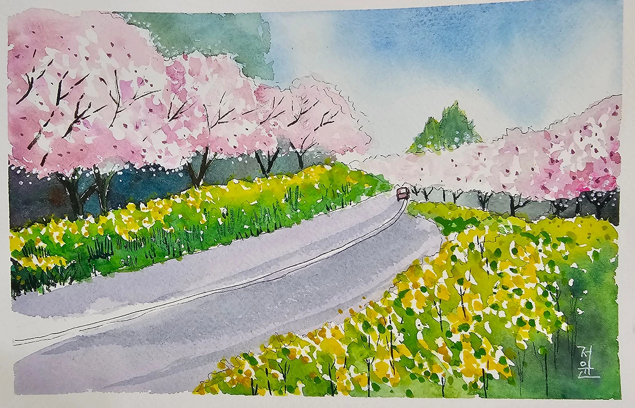 어제의 평생교육원 드로잉 수업 과제로 제주도의 벚꽃과 유채꽃이 어우러진 길 풍경입니다. 수강생들의 작품을 올려 봅니다.