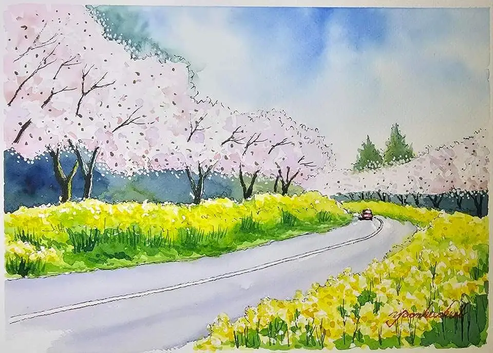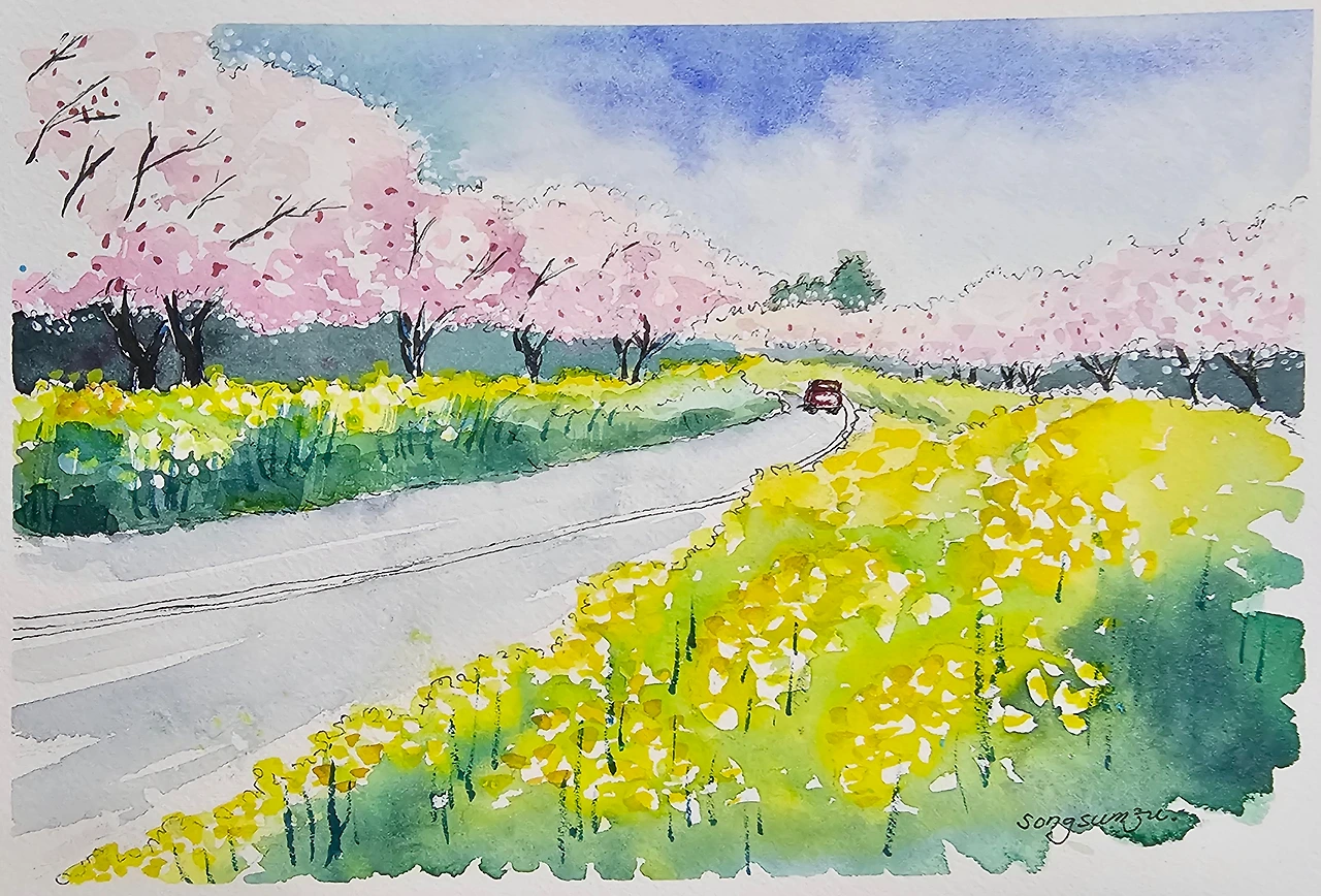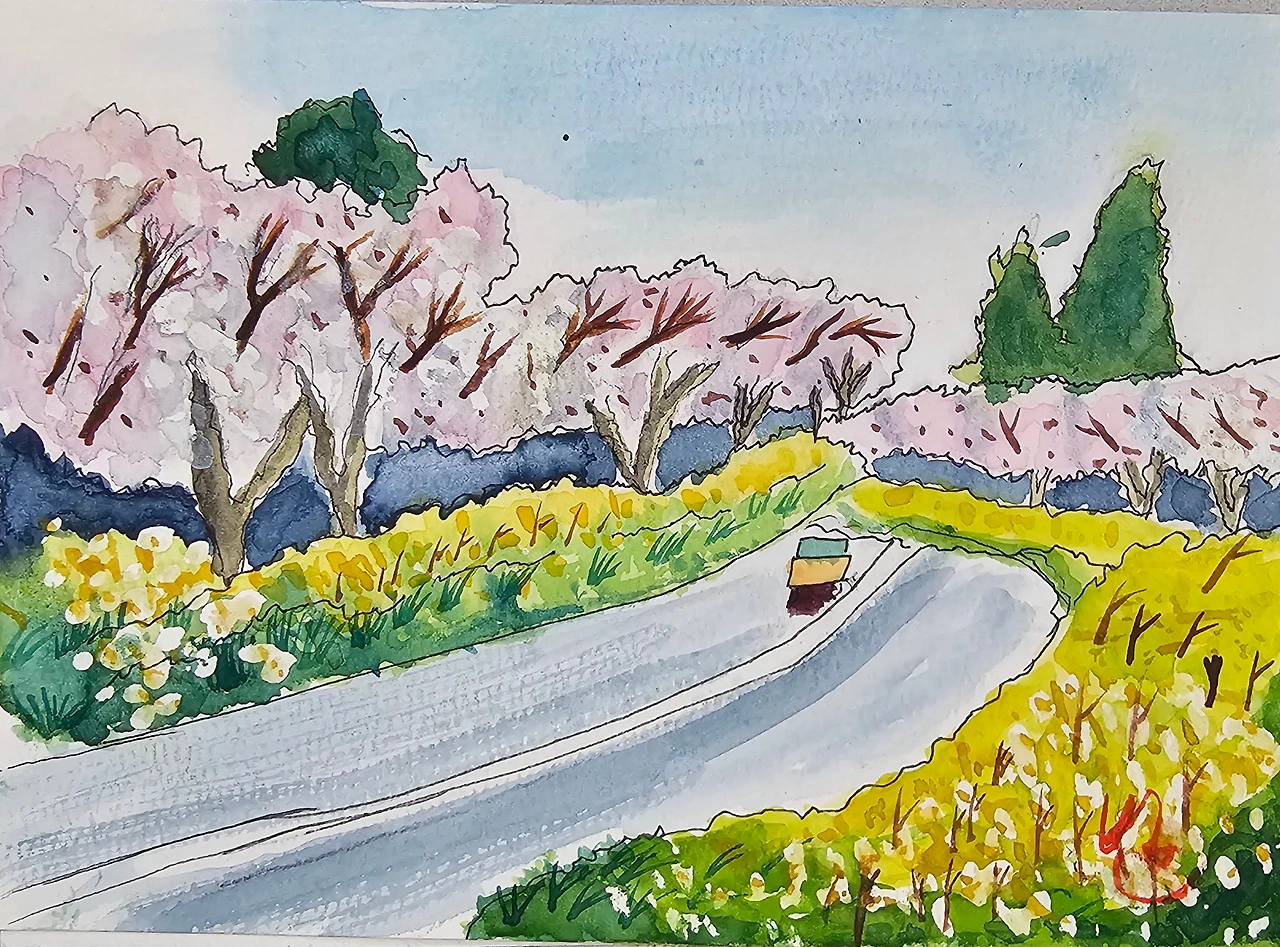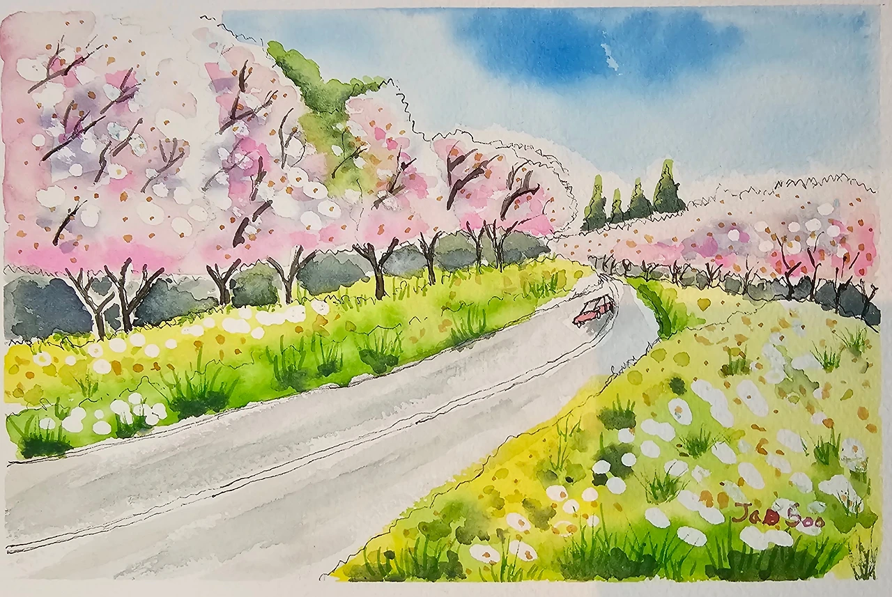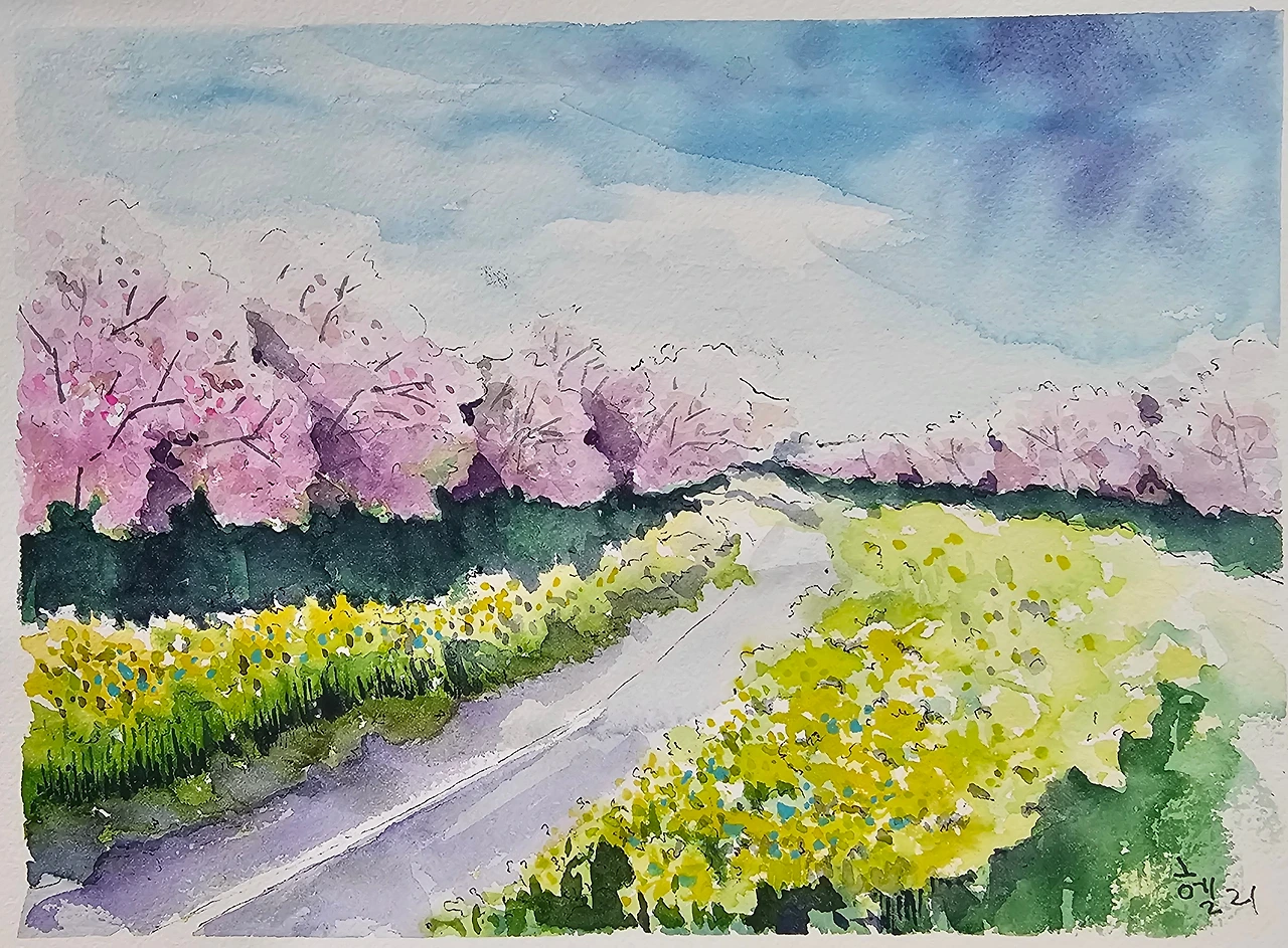 어제의 평생교육원 드로잉 수업 과제로 제주도의 벚꽃과 유채꽃이 어우러진 길 풍경입니다. 수강생들의 작품을 올려 봅니다.