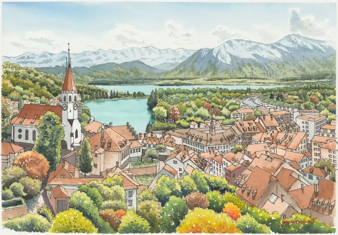 강 하구에는 강변을 따라 다양한 색상을 한 5층 내외의 건물들이 길게 붙어있는데 저층에는 카페와 레스토랑들이 줄지어 있어 중세 모습의 건축물들의 풍경과 더불어 흥미로운 가로 경관을 보여준다. 툰 호수 너머로는 아이거 봉과 융프라우 등 알프스의 고산들이 둘러싸고 있어 툰의 구시가지의 풍경과 어우러져 멋진 풍광을 선사한다.