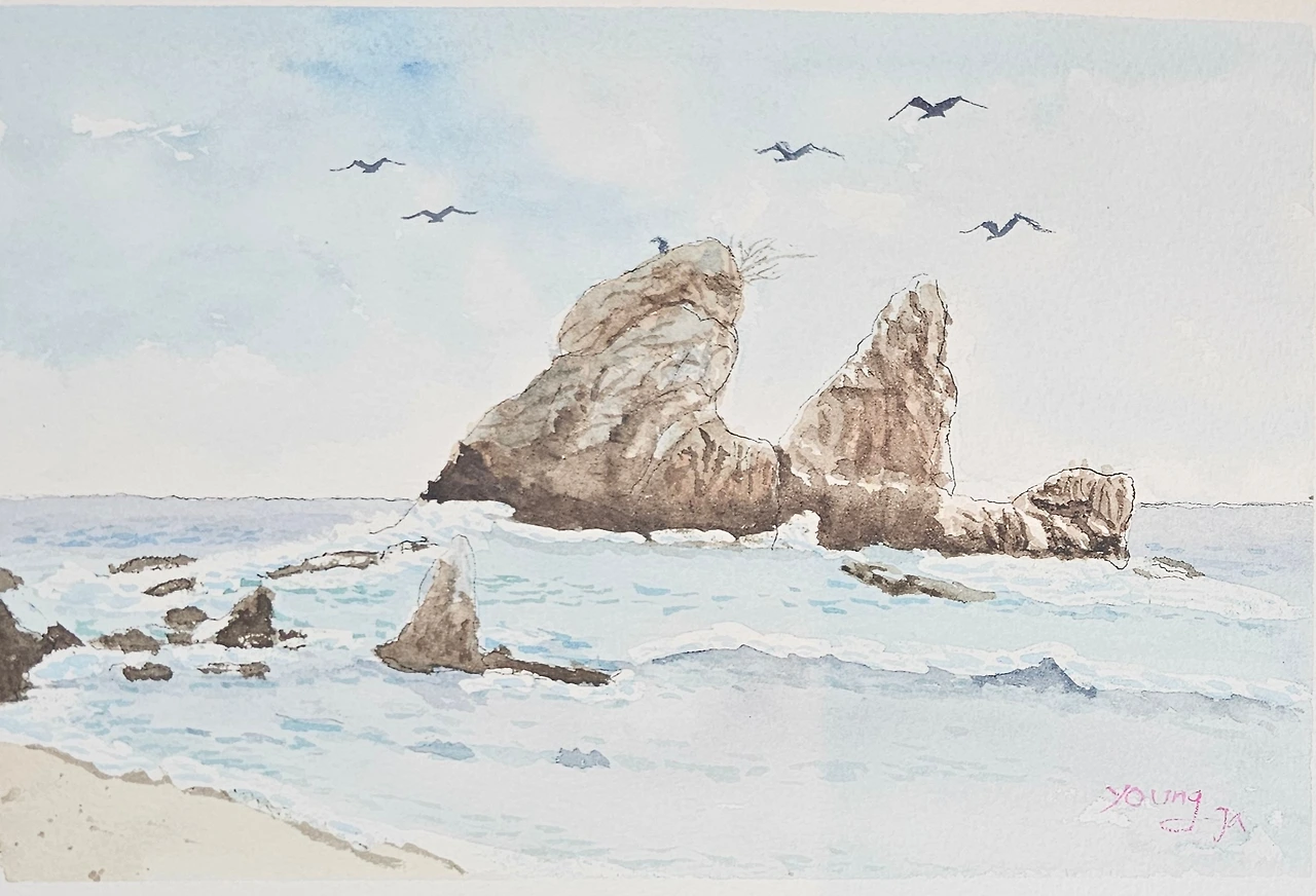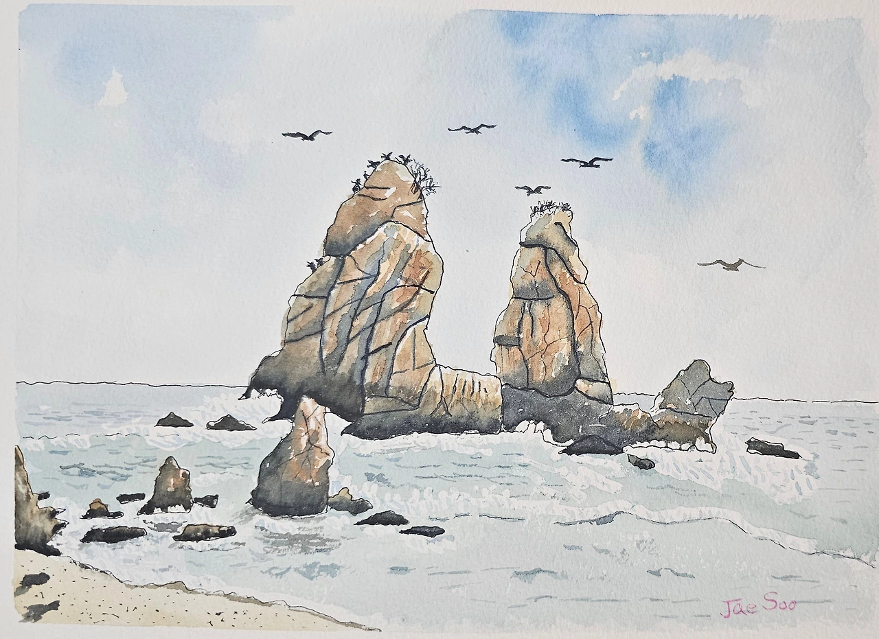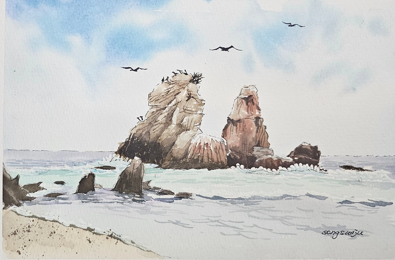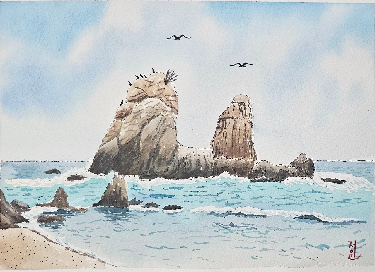 이제 이 장마가 그치면 바다가 많이 그립겠지요? 평생교육원 금주의 과제로 동해시의 추암 바위를 그려보았습니다. 수강생들의 그림과 저의 그림을 올려봅니다.'