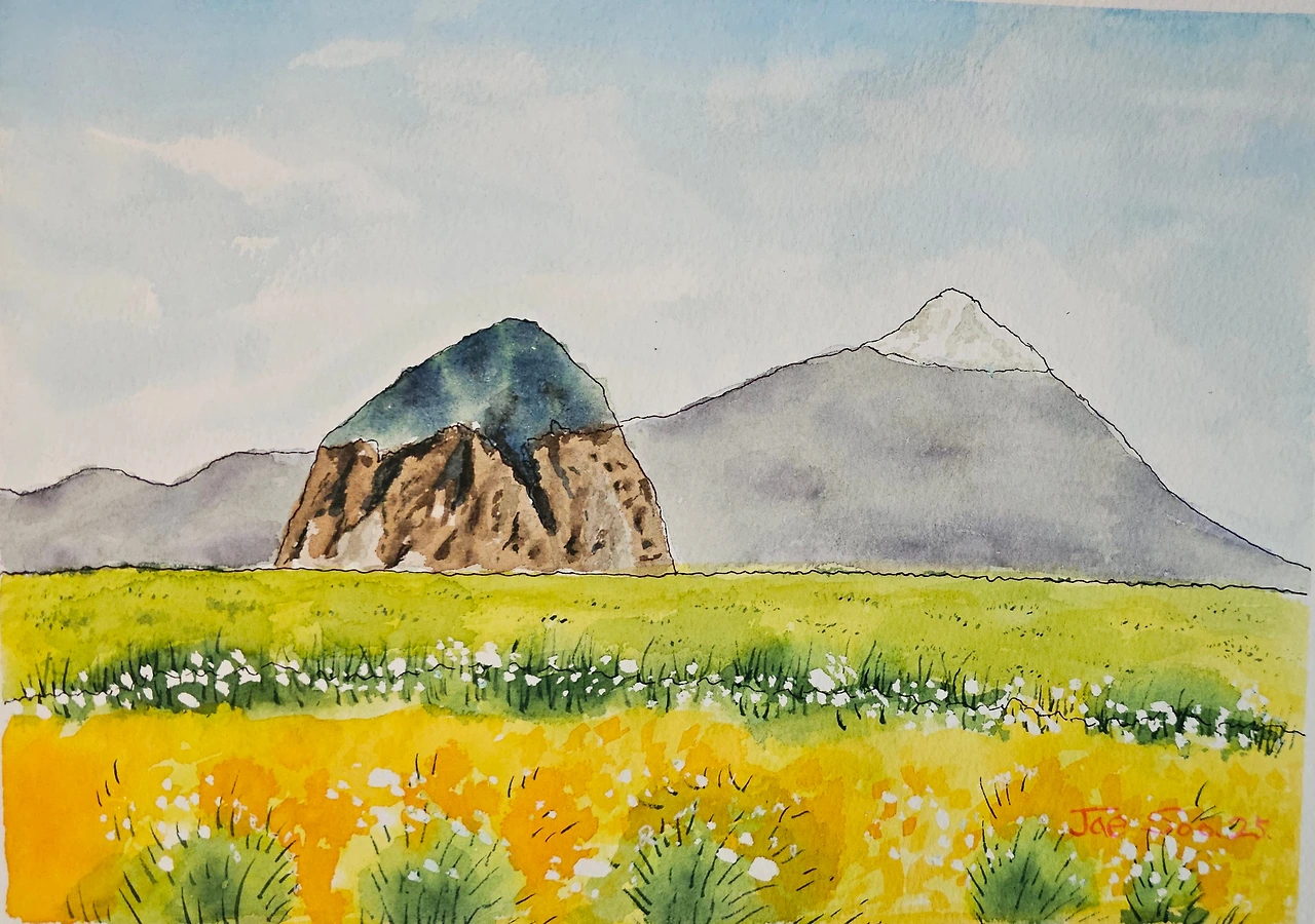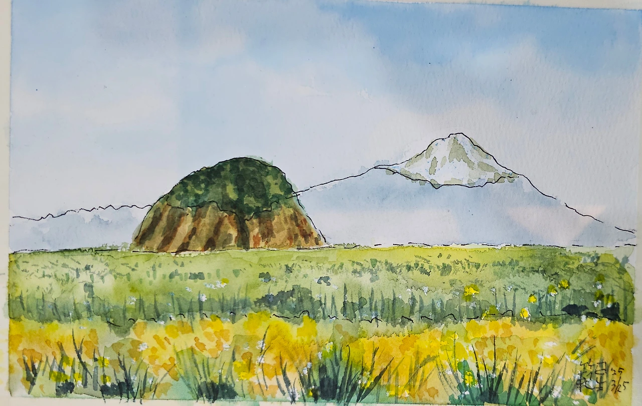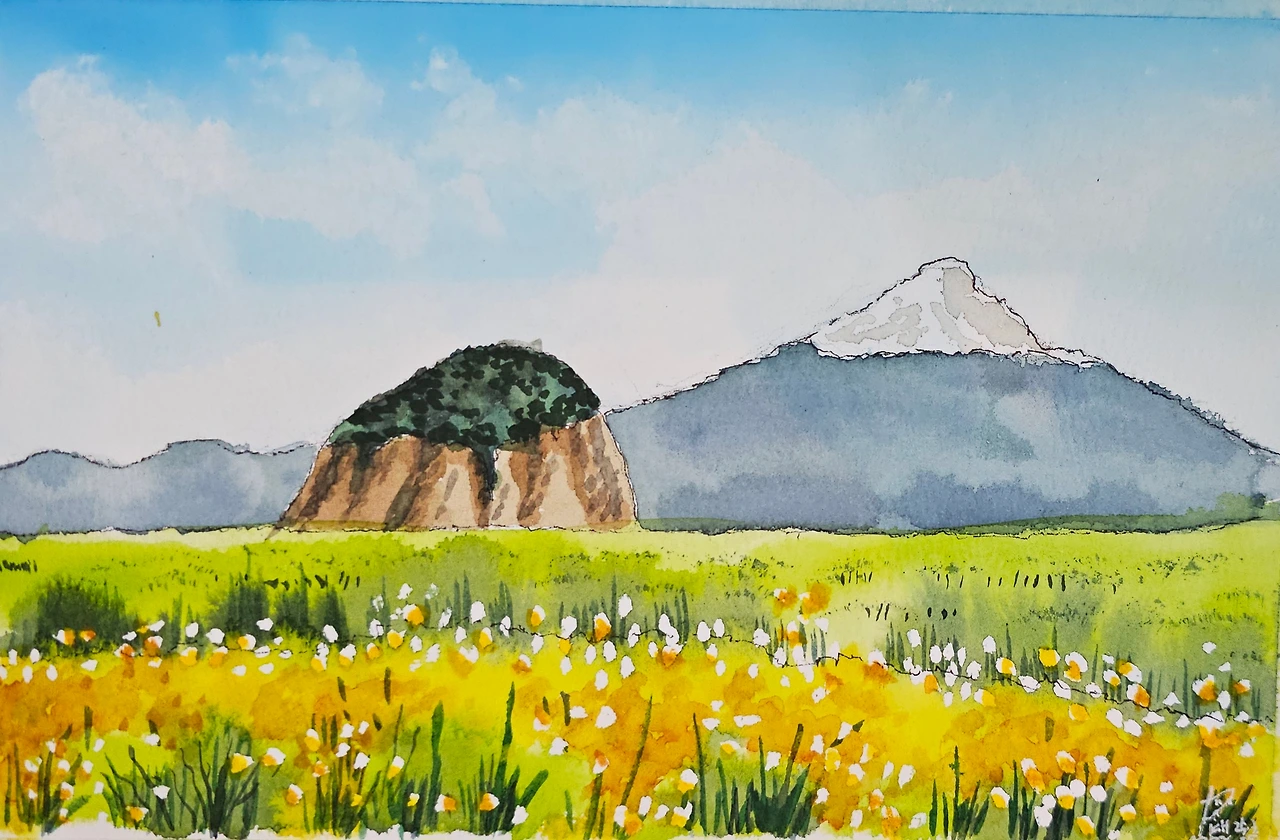중경의 산방산과 원경의 한라산을 배경으로 한 유채밭을 수강생들과 함께 그려보았습니다.