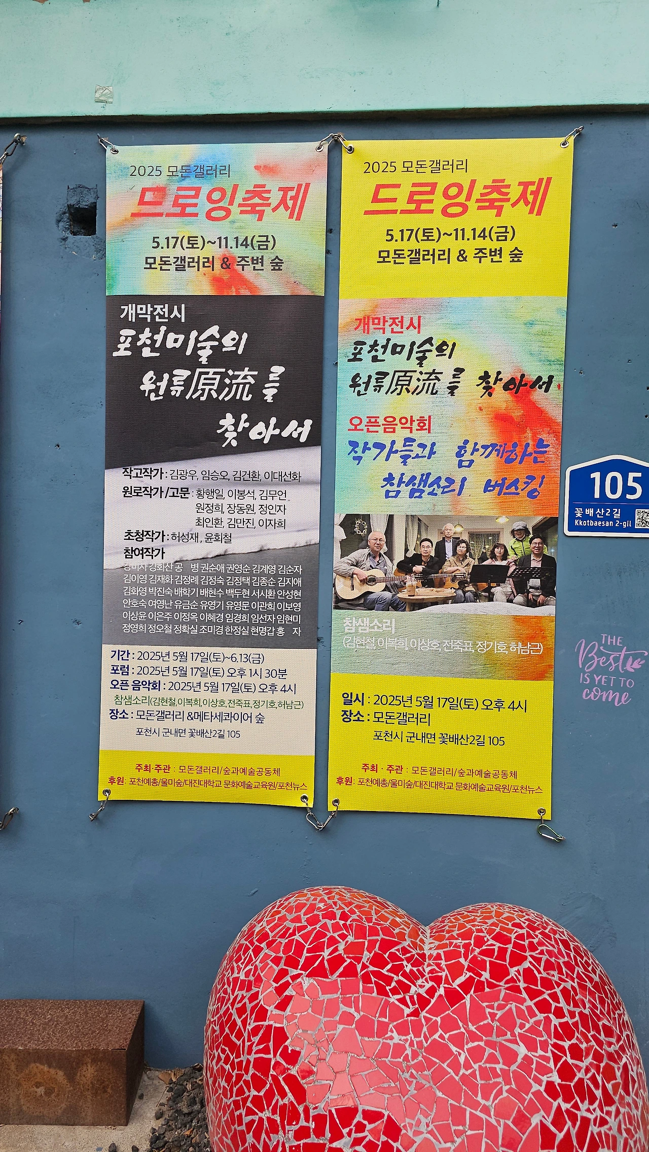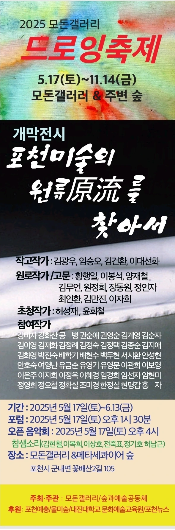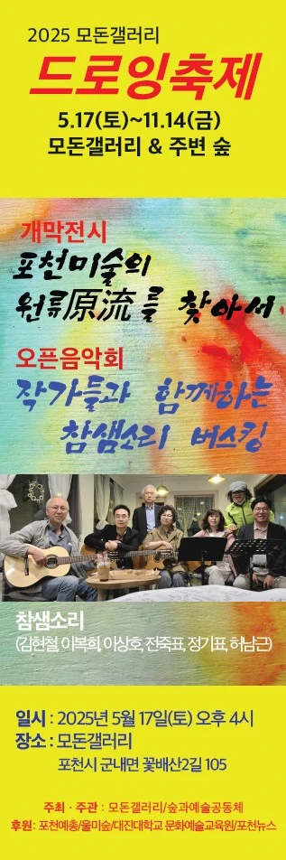 2025 모돈갤러리 드로잉축제가 5.17(토)부터 11.14(금)까지 진행됩니다. 연 150여명의 작가가 릴레이로 전시하고 음악회도 함께하는 축제입니다. 대체로 각 전시는 2주씩(월,화 휴관) 진행하는데 가장 많은 작가들이 참여하는 개막전은 4주간 이어집니다. 개막전은 <포천미술의 원류를 찾아서>라는 타이틀로 포천의 작고작가, 원로작가 및 고문, 초대작가, 참여작가로 구분하여 58명의 작가가 참여합니다. 개막일 오후 1시 30분에는 모든 작가들이 참여하여 포천을 비롯한 경기북부의 미술발전을 위한 워크샾이 열립니다. 4시에 개막식과 더불어 축하음악회로 포천의 전직 교장선생님들로 구성된 통기타 앙상블 참샘소리(김현철,이복희,이상호,전죽표,정기호,허남근)의 음악회가 이어집니다.