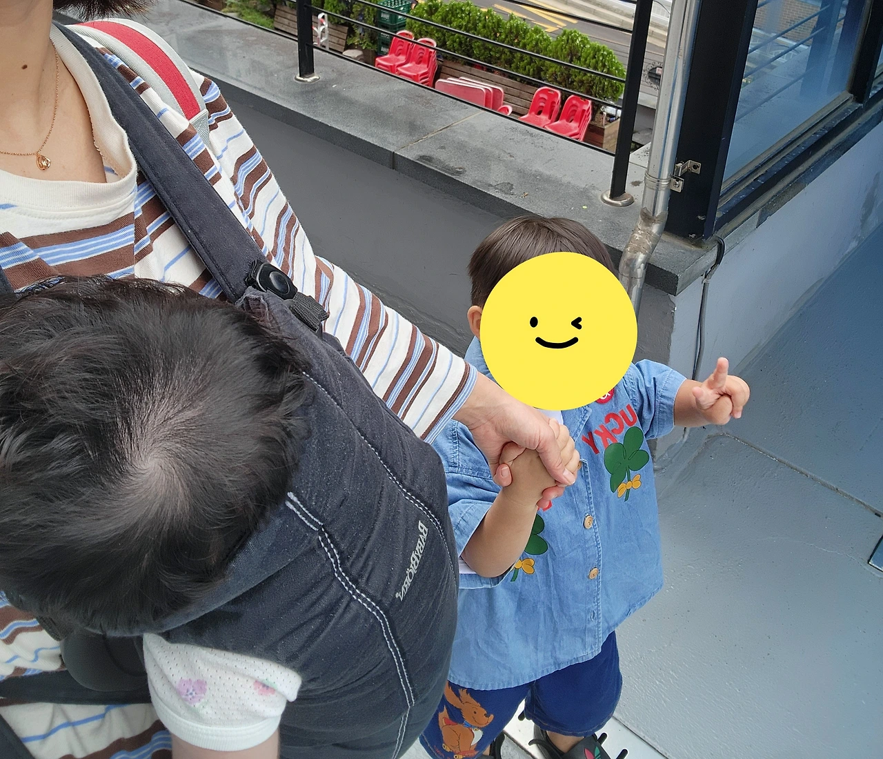 식사시간부터 자는 둘째는 여전히 아기띠에 안고 첫째 손을 잡고 어린이집으로 출발했다.