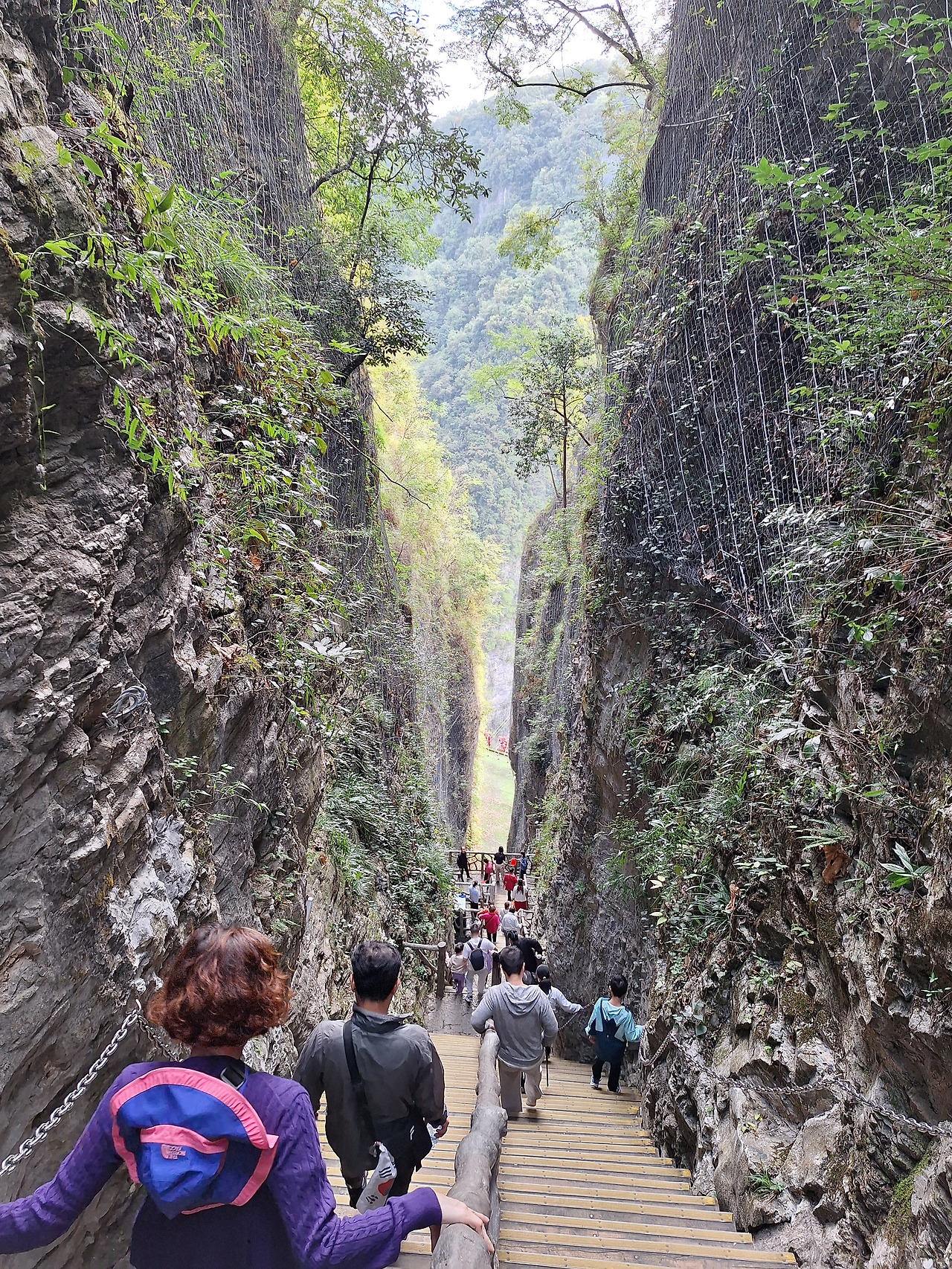부모님들이 소화하기에는 후덜덜한 일정이다. 많이 걷는 것도 문제지만 협곡의 아찔한 계단을 보는 순간 나조차도 다리가 발발 떨렸다. 난 계단에서 구른 경험이 있어서(술 먹고, 아닌 맨 정신에도) 까마득한 계단만 보면 오금이 저린다. 그런데 장가계 일정은 계단이 어마어마하다. 계단만 보면 옆으로 게걸음 하시는 시어머님과 엄마를 떠올리자 절로 고개를 가로저어졌다.