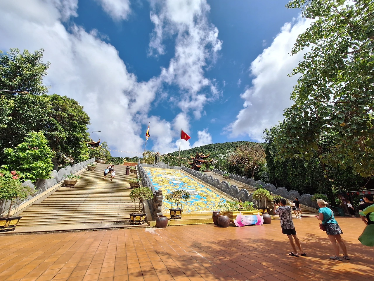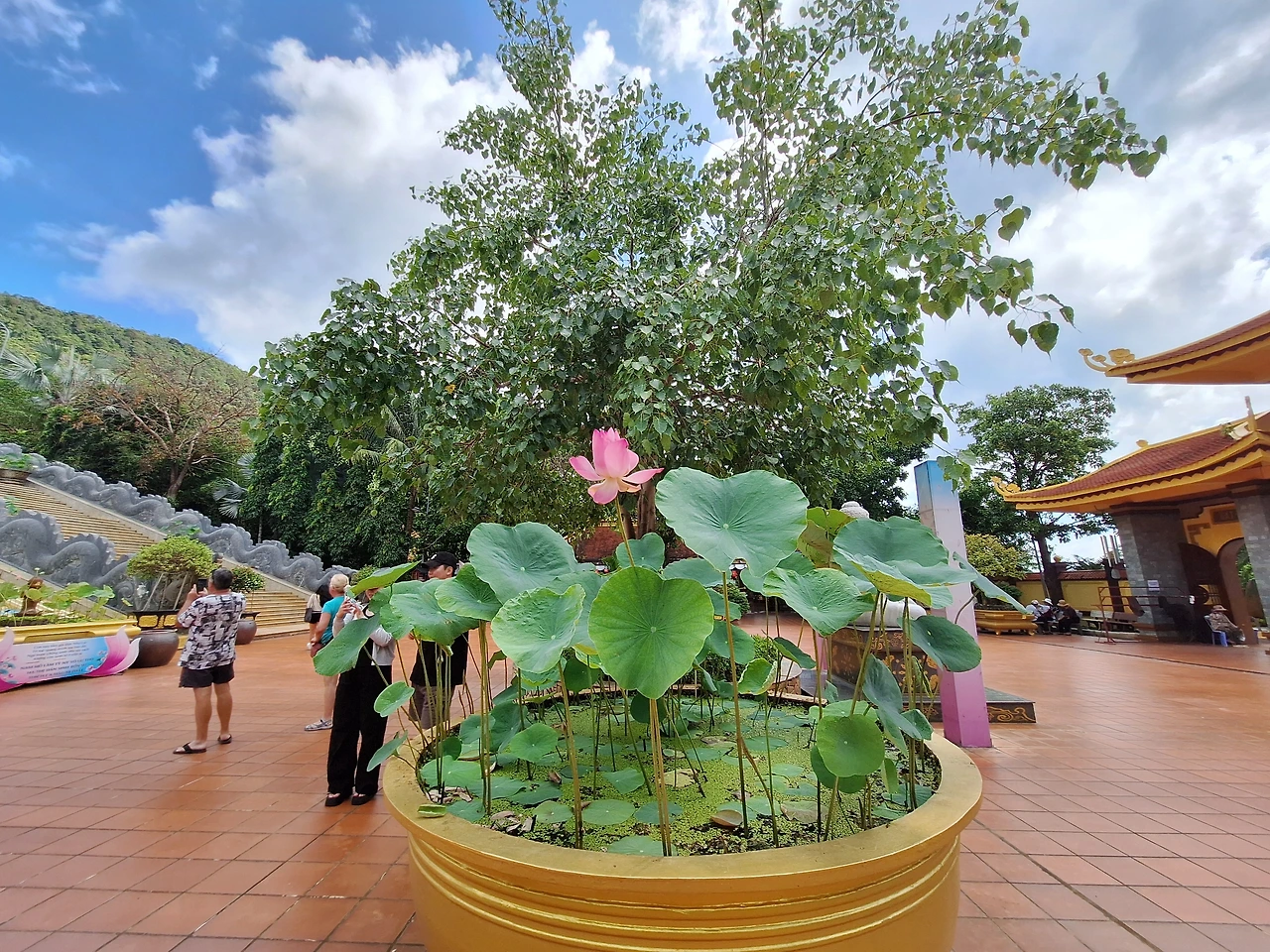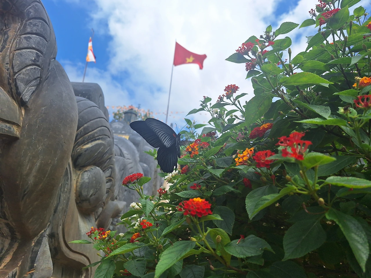 모닝투어 세 번째 코스는 호국사였다. 세상에 아침밥도 먹고 커피 마시고 세 번째 코스인데 아직도 오전 열 시 실화인가요? 알차다. 알차. 요런 생각을 하면서 호국사 계단을 올랐다. 경내엔 예쁜 연꽃 수조가 여러 개 있었고 호랑나비가 너울너울 날아다니고 세상 편하게 늘어진 멍선생이 바닥을 뒹굴고 있었다.(푸꾸옥은 어딜 가나 멍선생들이 많았다. 오토바이만큼이나)