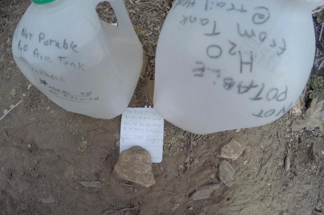 트레일 엔젤이 가져다 놓은 듯한 물통 두 개를 만난다. 정수가 되지 않은 물이니 꼭 정수를 하라는 메시지가 통에 쓰여있었다. 옆으로는 또 다른 길이 있었는데, 그 길로 가면 물이 있는 듯 다른 하이커가 물을 받아온다. 물이 부족한 느낌에 서둘러 온 급수 포인트인데, 그렇다고 물을 받으러 옆길로 새기도 싫은 눈치다. '아직은 운행하며 마실 물은 있으니까' 하며 약간 쳐진 형을 위해 메시지를 남긴다.