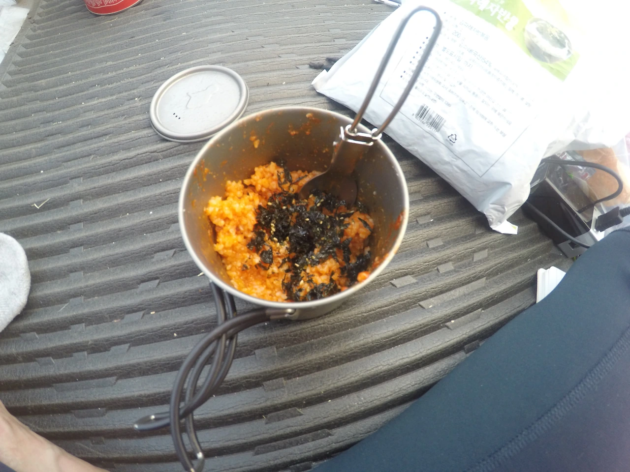 텐트 안에서 방금 지은 밥을 전날 어르신께서 주신 볶음 고추장과 김자반과 함께 게걸스럽게 먹어 치운다.