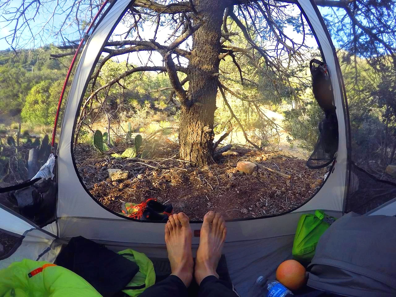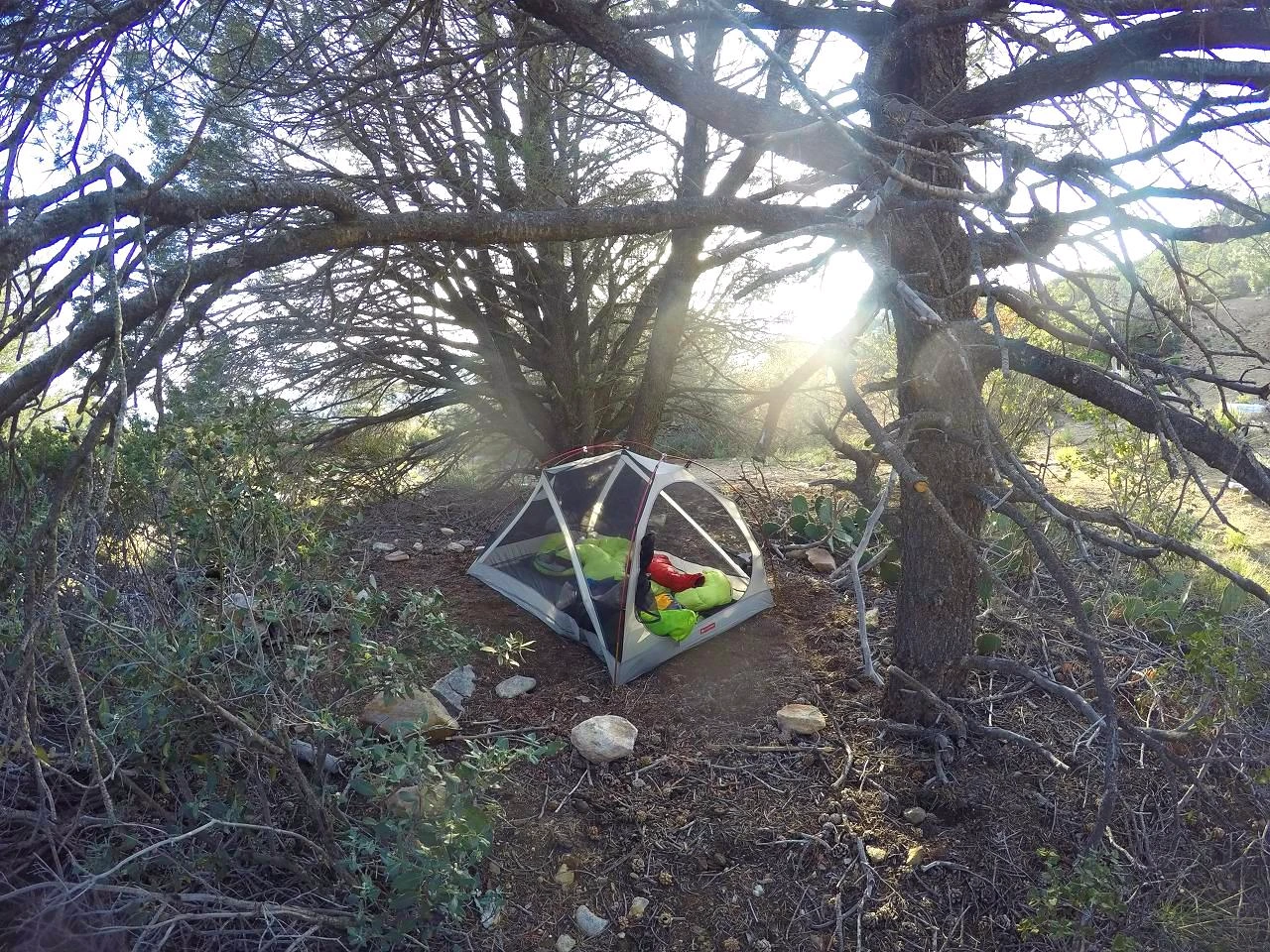 오늘 사이트는 정말 완벽해 보인다. 나무 아래 히맨만을 위한 보금자리. 텐트를 둘러싼 나무들이 안전하게 지켜줄 것만 같다.