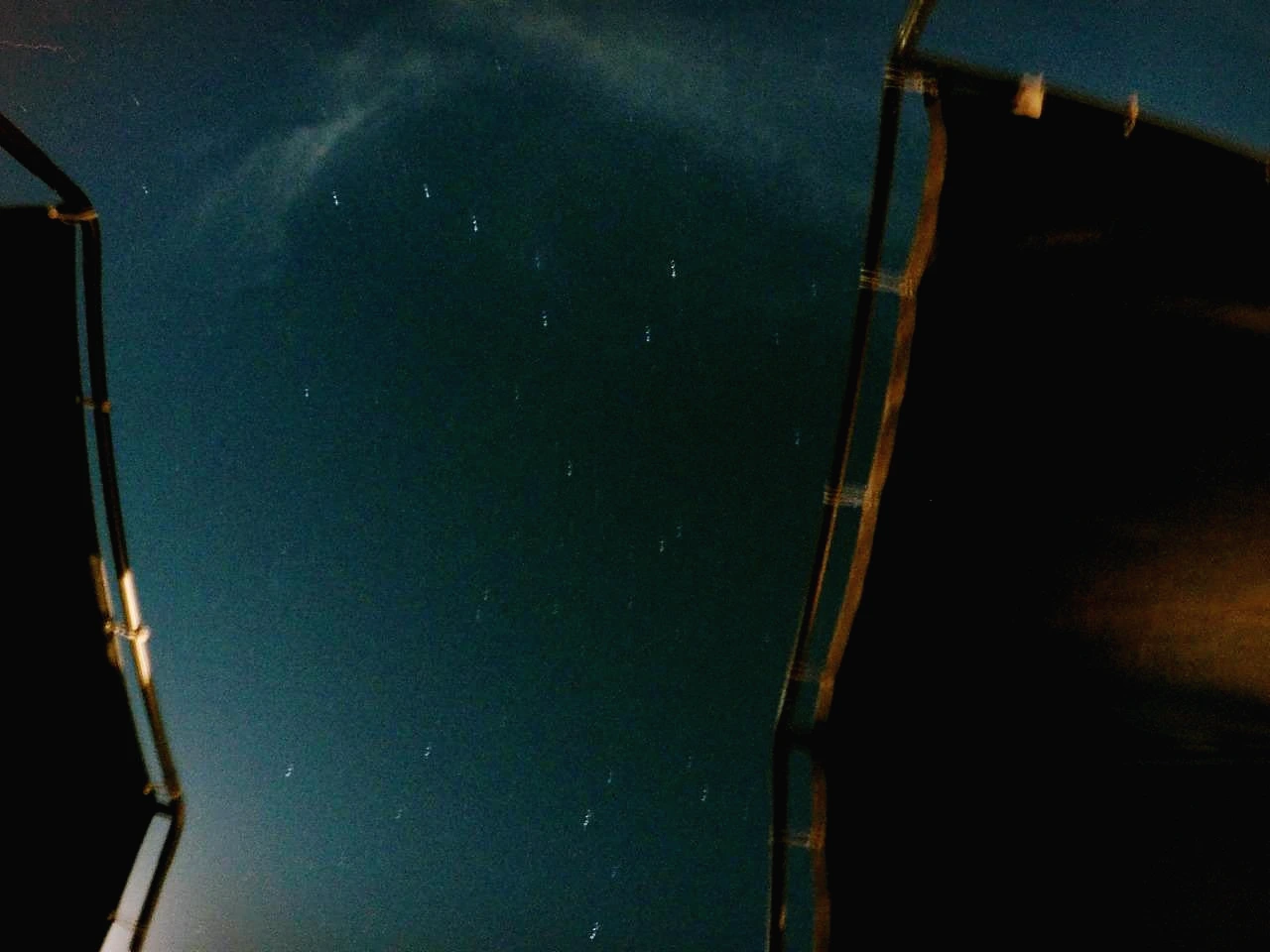 누운 자리 바로 위 지붕 사이로 보이는 밤하늘. 별이 반짝인다.