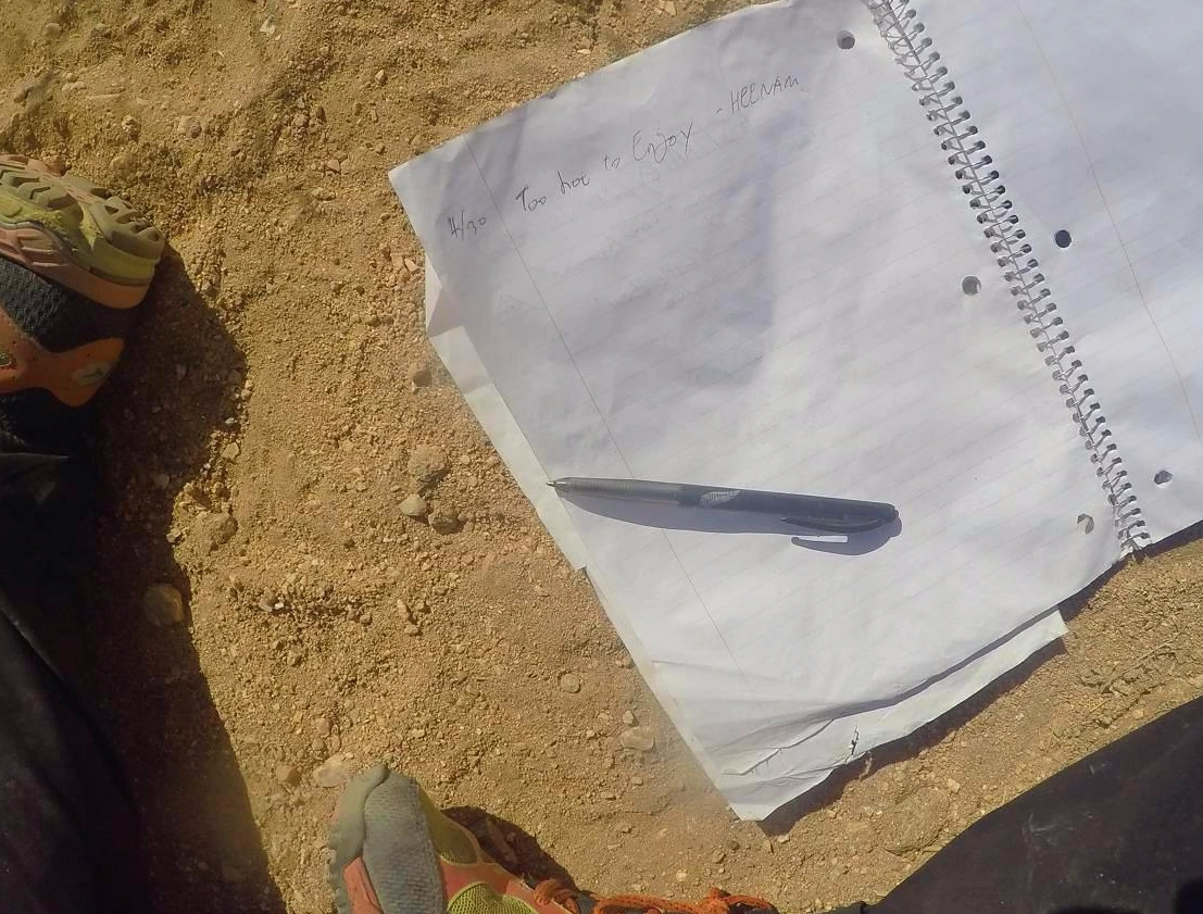 지기 앤 베어를 얼마 남기지 않은 곳에서 방명록이 나타난다. 커다란 돌로 눌러놓은 방명록을 살펴본다. 더위에 지쳐 그 자리에 주저앉은 채.