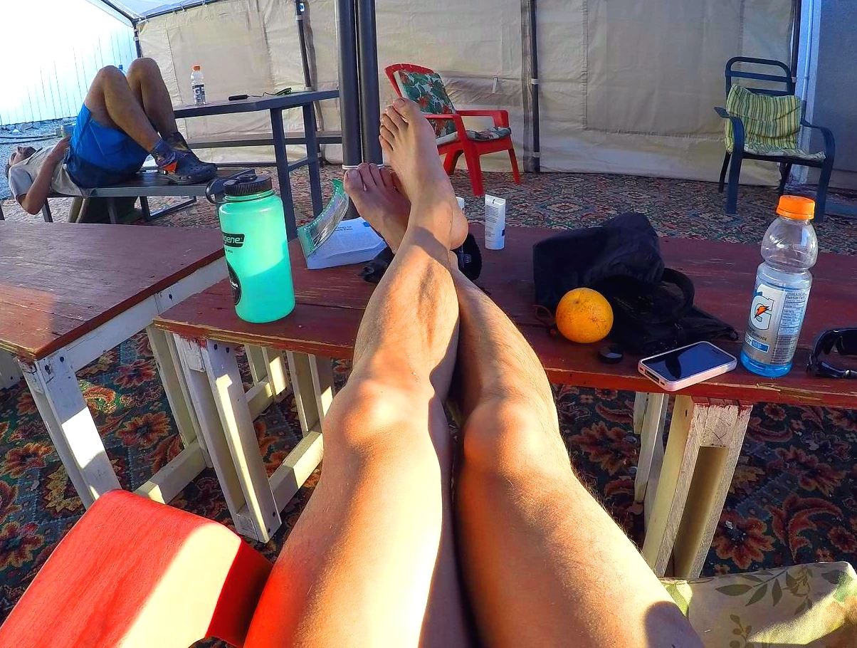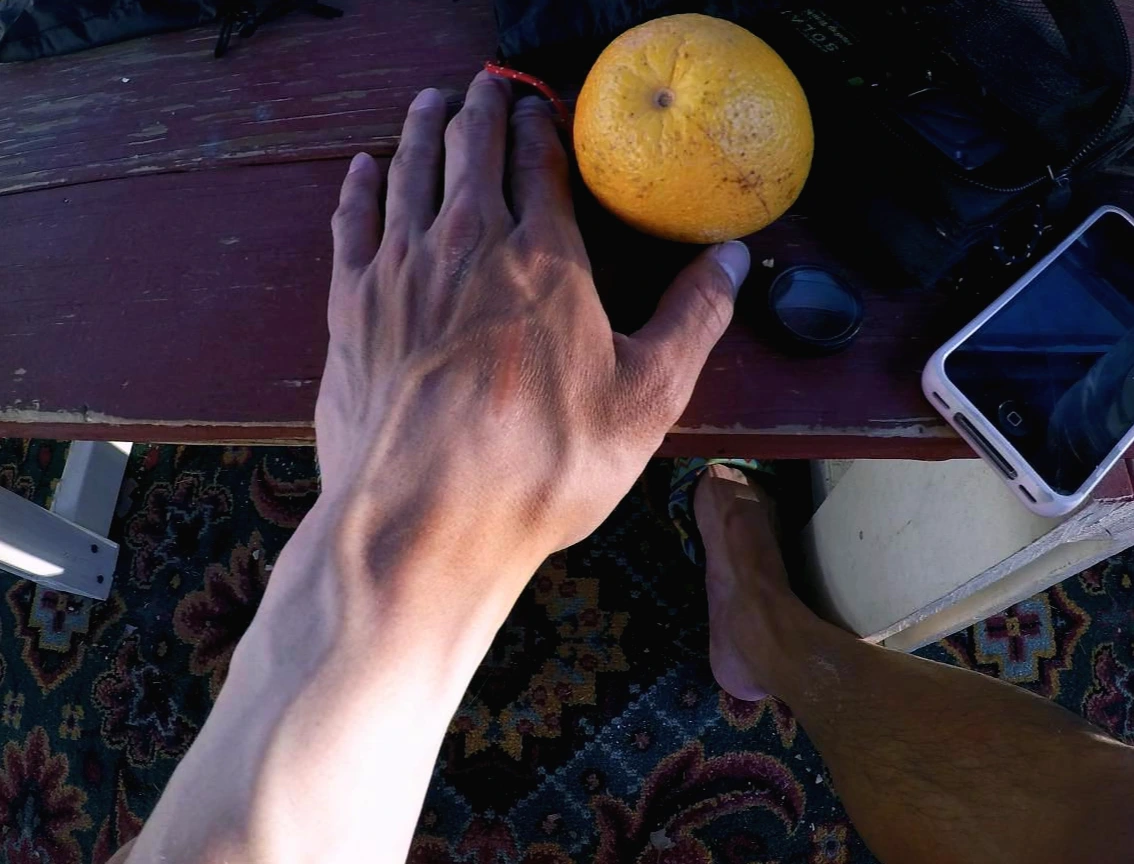 갑자기 무언가 떠올랐는지 고프로를 들고일어나더니 배낭을 놓은 자리로 향한다. 그리곤 아까 벗어 놓았던 구멍 난 양말에 렌즈를 갖다 댄다.