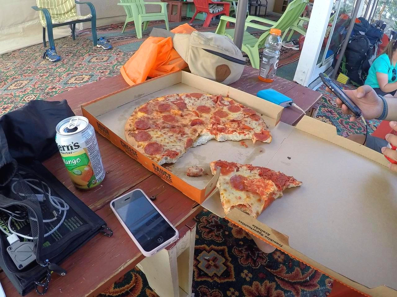 슬슬 배가 고파온다. 오늘 저녁은 지기 앤 베어의 공짜 피자에 1달러 주고 산 망고주스! 식은 피자이기는 하지만 PCT 하이커가 가릴 것이 무엇이 있겠는가. 망고주스와 함께 정신없이 피자를 뜯는다. 그리고 매우 짠 치킨도 몇 조각 먹는다.