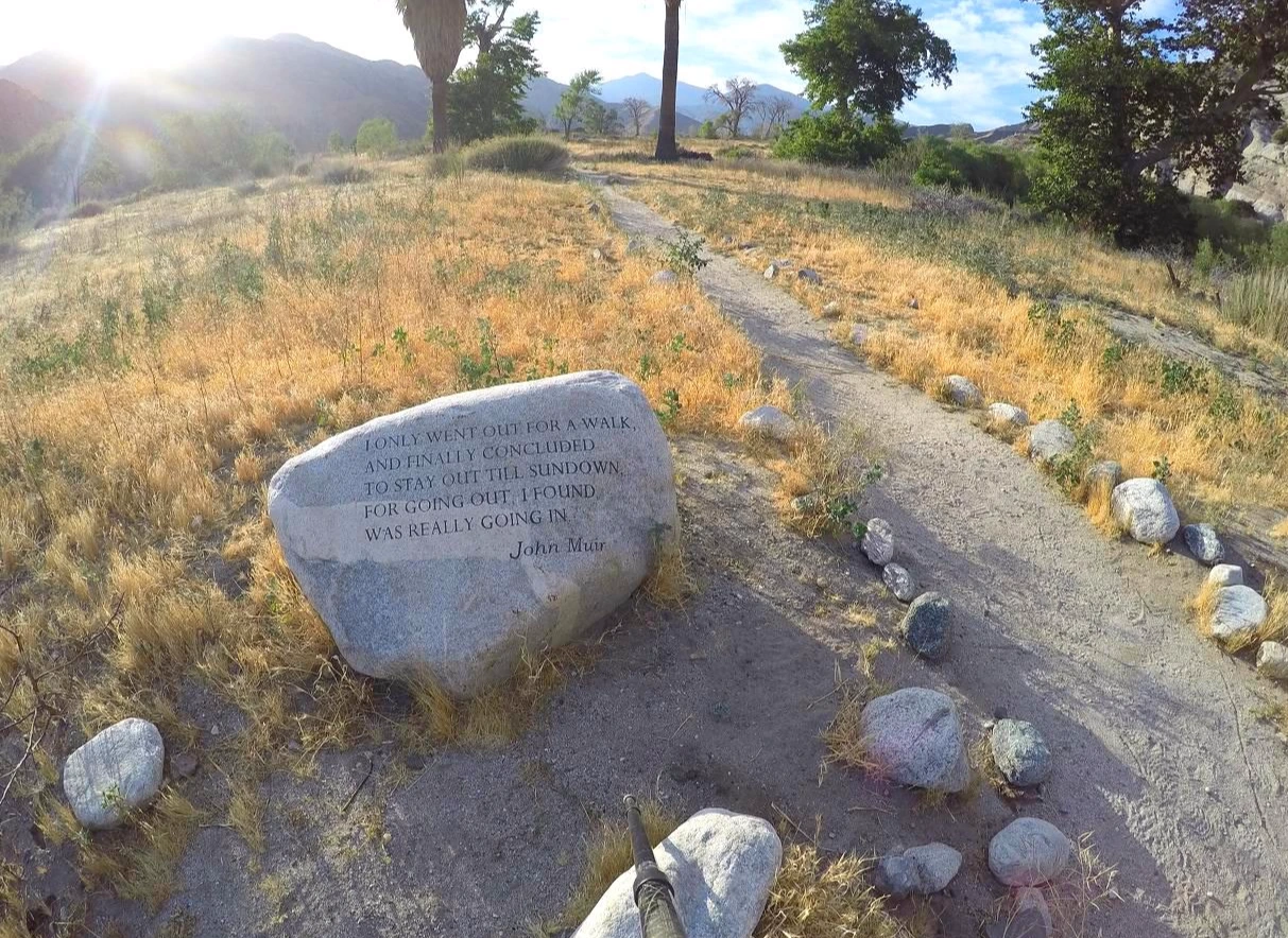 화이트워터를 벗어나며 잠시 멈춰 고프로를 들이댄 이유는 돌에 새겨진 문구가 눈에 들어왔다기보다는 적잖이 들어왔던 '존 뮤어'라는 친숙한 이름이 적혀 있었기 때문일 것이다. 길과 함께 있는 예쁜 그림을 찍고 싶은 마음이었겠지.