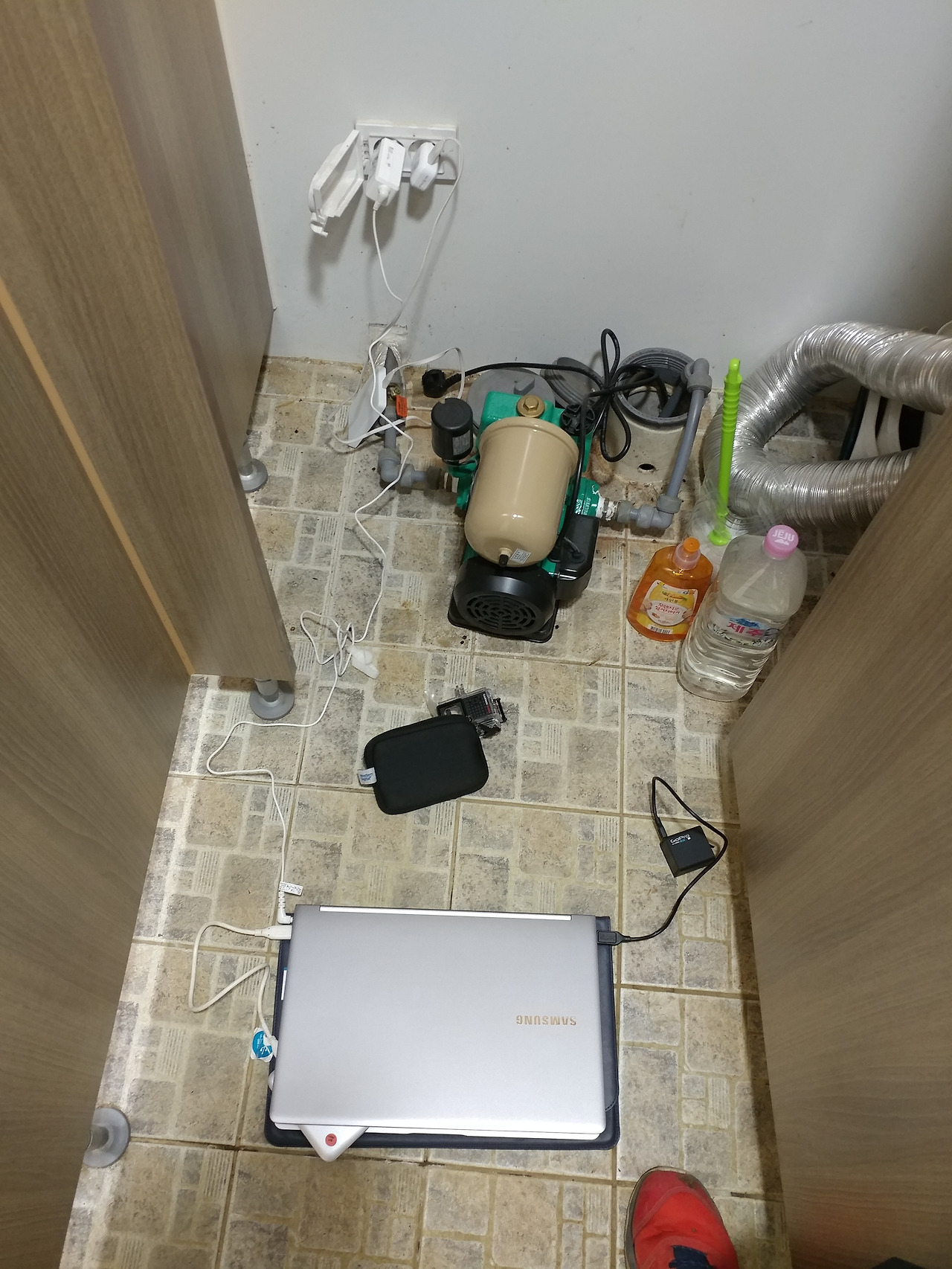 지금까지의 운행 보고와 현재의 상황을 공유하기 위해 사무엘님에게 전화를 했다. 가까운 머물만한 곳을 찾아주셨는데 다행히도 가까운 곳에 텐트를 칠만한 곳이 있었다. 도로를 따라 내려온 그곳에서 가장 먼저 눈에 띈 곳은 영업이 끝나 불이 꺼진 매점이었다. - 아 매점을 털고 싶다는 생각이... - 거린사슴 전망대 데크에는 망원경이 있었다. 통화중에 이곳이 야경과 별 촬영장소로 유명하다는 이야기를 들었기에 참 사이트로써의 사용이 사실 부담스러웠다. 하지만 결정적으로 깔끔해 보이는 화장실의 창고에 위치한 콘센트는 나의 마음을 사로잡았다. 전망대 데크와 화장실 사이의 거리가 좀 있어 어둠을 뚫고 오가야 했지만 찬밥 더운 밥 가릴 처지가 아니었다. 그야말로 거지처럼 전기를 구걸하듯 화장실 소변기 앞 바닥에 앉아 노트북을 연결하고 고프로 배터리를 연결했다.
