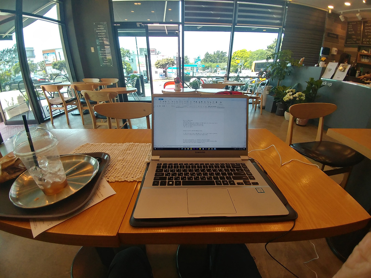 중문에서 버스를 한 번 갈아타야 했다. 배차시간은 길었고, 근처에서 쉬다가 시간에 맞춰 버스를 타기로 한다. 산으로 들어가기 전 뭐라도 좀 먹고 가야겠다며 돌아다니다가 한 카페에 들어갔다. B.E.L.T. 샌드위치와 커피를 시켰다. 조금 비싸다는 생각이 들었던 샌드위치는 기대 이상이었다. 11시 15분 버스를 탈까 하다가 조금 더 여유를 만끽하고 싶어 졌다. 한 시간의 여유가 생긴 나는 노트북을 꺼내 글을 썼다. 마치 여행작가가 된 느낌이었다.