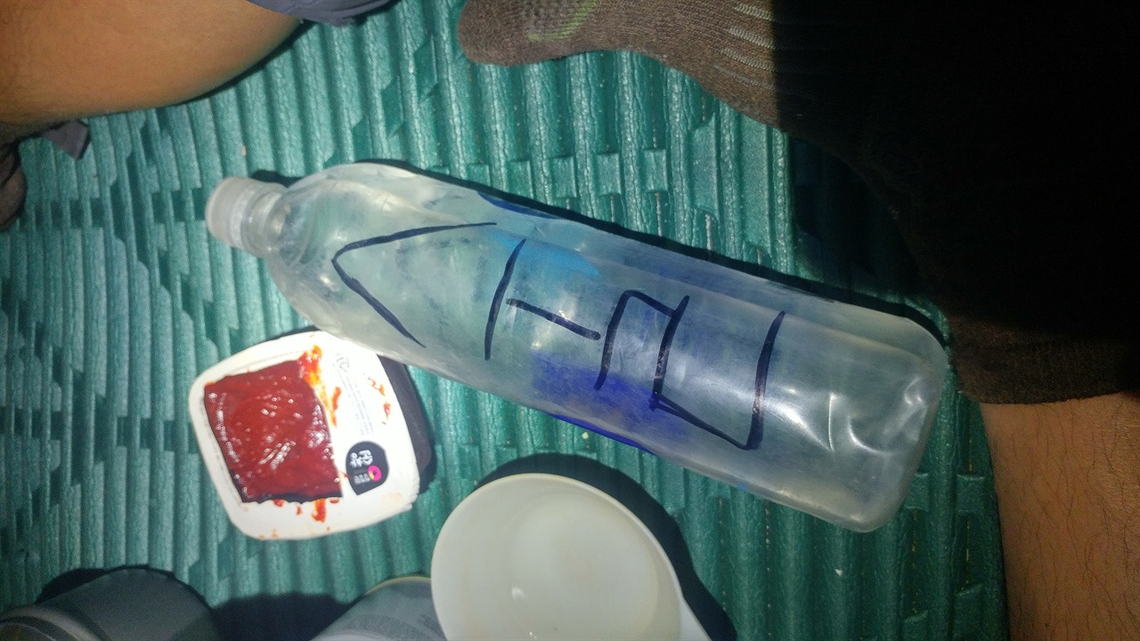 ▲ 페트병 술통. 가끔 물이랑 헷갈려서 마신 적이 있기에 네임펜으로 술이라고 크게 써놓았다. ⓒ 정기건
