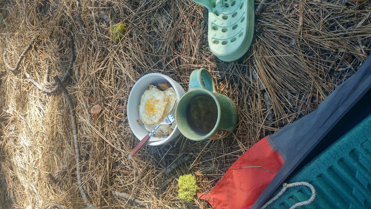 ▲ 방랑자를 위한 호의. 인근주민이 내 텐트로 아침에 커피와 계란 프라이를 가져다 주었다. ⓒ 정기건