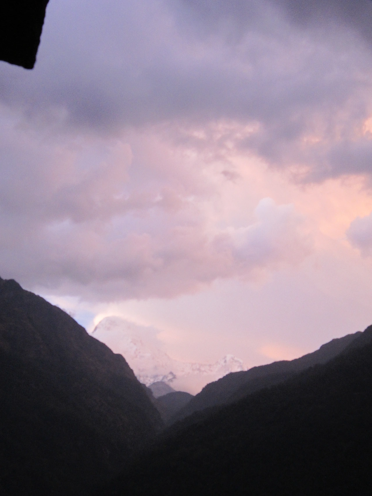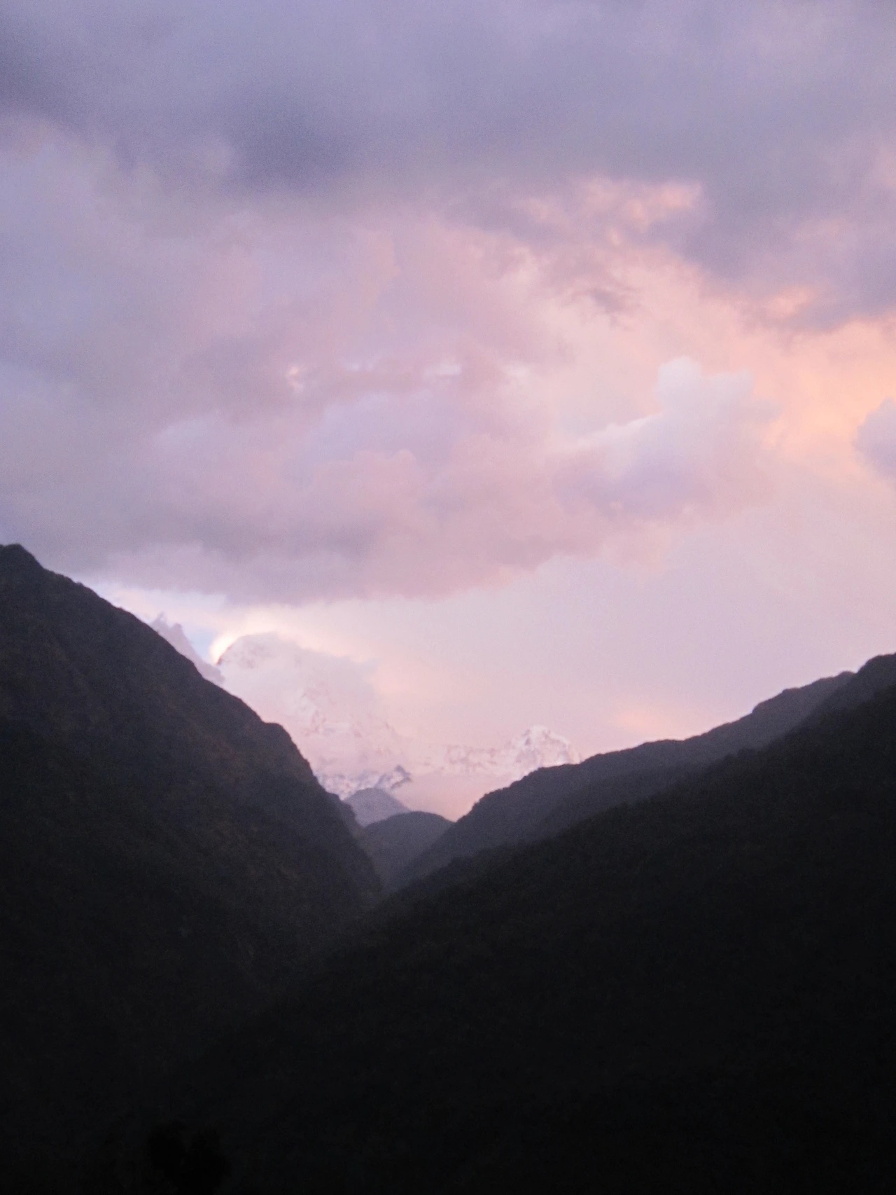 그때였다. 식당에서 숙소로 올라가던 길에 계단 옆에 있던 발코니에 잠시 섰는데 설산이 보였다. 네 명이 모두 모여 설산을 바라보았다. 저 아름다운 곳에 우리가 조금씩 가까워지고 있다니, 그런 생각을 하자 조금씩 행복해지기 시작했다. 다행히 가방 속에 고이 챙겨갔던 칼로리바가 생각나 급히 들고 왔다. 우리는 함께 칼로리바를 야무지게 뜯어먹으며, 질리도록 설산과 그 위로 붉게 덮이는 노을을 바라보았다. 이 여행에 다이어트보다 더 좋은 이유가 생긴 것 같았다. 저 하늘, 저 노을, 그리고 저 산. 이 아름다움이 충분한 이유가 되겠구나.