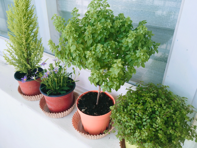 결국 팔목에 주렁주렁 봉지를 끼우고 양 손에 하나씩 화분을 들었네요. 오른손에는 초록초록 잎들이 가득한 향기로운 율마, 왼손에는 사계절 꽃이 피는 사계 국화가 곱게 들려 저희 집으로 이사를 왔지요. 오자마자 흠뻑 물을 주고 닦아준 후 베란다에 제 방을 만들어 줬어요. 이미 둥지를 튼 바질과 천사의 눈물도 잎을 흔들어 새 친구들에게 인사를 해주었습니다.
