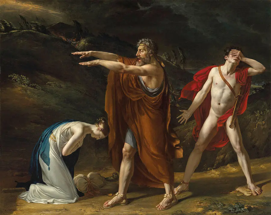 진실을 마주한 오이디푸스가 스스로 눈을 찌르자, 유일하게 곁을 지킨 이는 딸 안티고네였다.