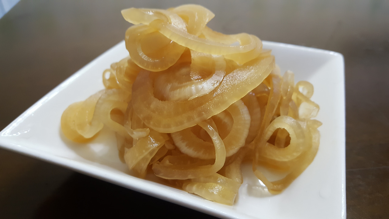인스턴트 냉면에 올리려고 통양파 장아찌를 얇게 썰어 놓고 보니 간장물에 갈색으로 물들어 먹음직하게 보인다. 시간을 지나면서 오월의 아름다웠던 반짝임을 잃고 깊은 맛으로 물든 나의 양파장아찌.