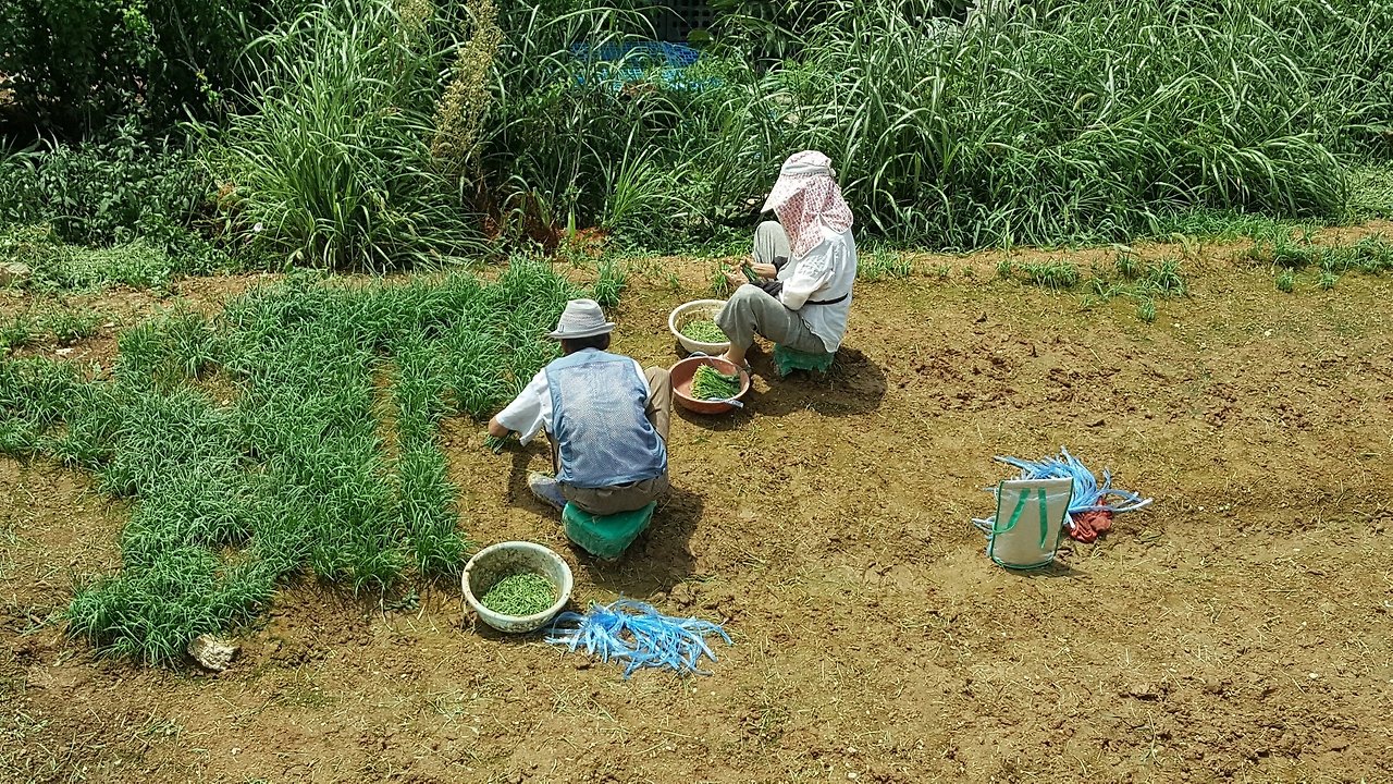 농부 내외가 나란히 앉아서 부추를 잘라 손질하는 모습이 참 정다워 보여 허락도 없이 사진을 찍었다.작년 여름 따가운 볕을 온몸으로 받으며, 거의 매일같이 사십 분을 걸어 밭에 갔다. 밭에 걸어가는 길에 나 같은 아마추어는 흉내도 못 내는 숙련된 농부의 밭을 지났다. 아마 예전에는 농사를 꽤 많이 지었겠지만 아파트가 들어서고 상가가 생기면서 많던 논과 밭을 팔고 이제는 소일거리로 당신들 먹을 것과, 가외로 장에 내다 팔 것들을 조금 더 길러내는 할아버지 할머니의 밭이 많았다. 평생 농사를 업으로 살아온 그분들의 밭은 정갈하기 이를 데 없이 아름다웠다. 자식들을 길러내고 하루 또 하루 살아가기 위해 정직한 노동으로 세월을 지나온 나이 많은 농부의 밭에는 전문가들에게서 보이는 간결하고 단순하지만 수많은 복잡한 것들을 명쾌하게 설명할 수 있는 지혜가 있다. 살이의 고단함과 그 고단함을 이겨내려는 전 생애에 걸친 부단한 노동에서 나온 아우라가 아닐까 감히 나 같은 아마추어가 짐작해 볼 뿐이다.