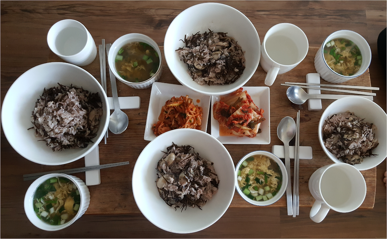 오늘은 김장하는 날. 내가 가장 수고하는 날이니 눈치 보지 않고 내가 좋아하는 밥으로 아침상을 차린다. 이미 전날 양념을 만들고 배추를 절이느라 몸은 벌써 지치고 집은 큰 대야와 소쿠리, 김장을 담을 김치통으로 야단법석이라 될수록 간단하지만 든든한 메뉴인 톳밥을 골랐다. 식탁은 김장 재료가 널려있어 평소에 과일을 먹는 작은 앉은뱅이 상에 둘러앉았다.