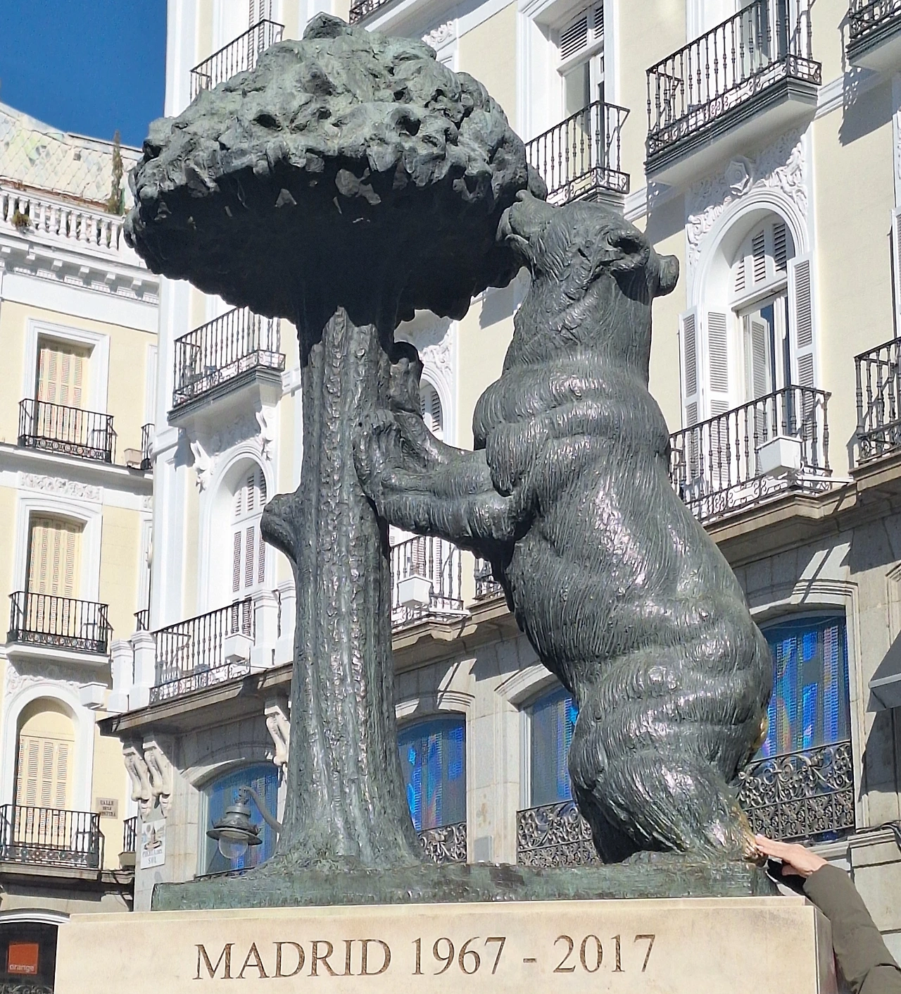 첫째, 곰이 딸기나무 열매를 따먹으려는 동상이다. 이 동상은 시의회(세속 권력)와 교회(종교 권력) 사이의 타협과 화합을 의미한다. 나무는 시의회가 소유한 '숲'을, 곰은 교회가 소유한 '초원과 가축'을 대표하며, 곰이 나무에 기대어 있는 모습은 두 세력의 자산 분배와 공존을 의미한다라고 한다. 과거 마드리드 근교에 곰이 많이 살았고, 곰이 따 먹으려는 마드로뇨(딸기나무) 열매는 마드리드의 비옥한 토지와 번영을 뜻한다. 현지에서는 이 동상의 뒷발꿈치를 만지면 마드리드에 다시 돌아온다는 속설이 있어 늘 사람들의 손때로 반질반질하다. 뒷발꿈치와 꼬리 부분까지
