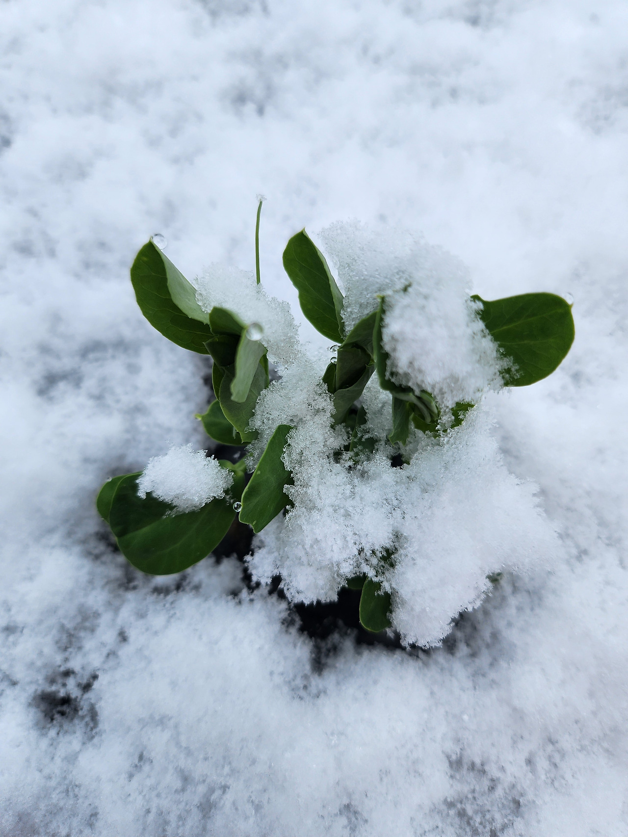 어제 내린 눈을 흠뻑 맞은 완두와 냉이