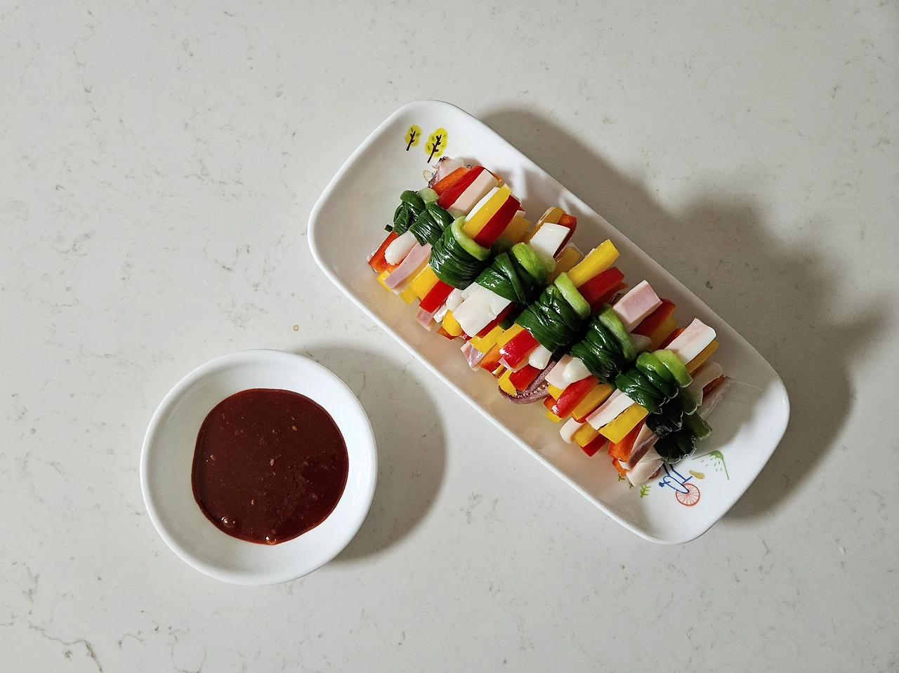 5. 오징어와 파프리카를 색깔별로 한 조각씩 잡고 파로 둘둘 말아준다.