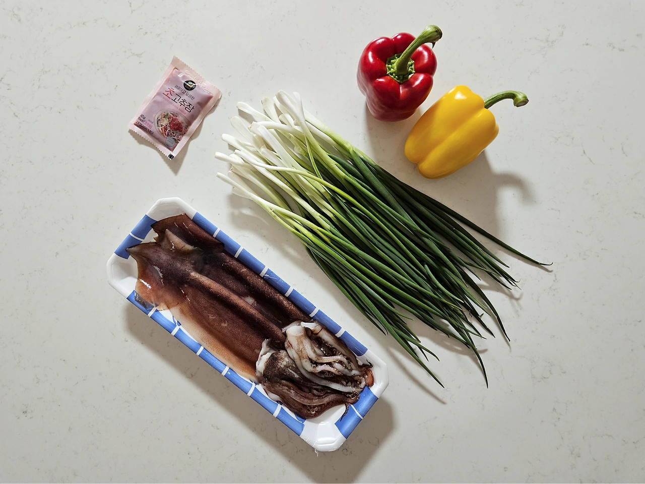 4. 오징어를 손질하여 데치고 파프리카와 같은 길이로 썬다.