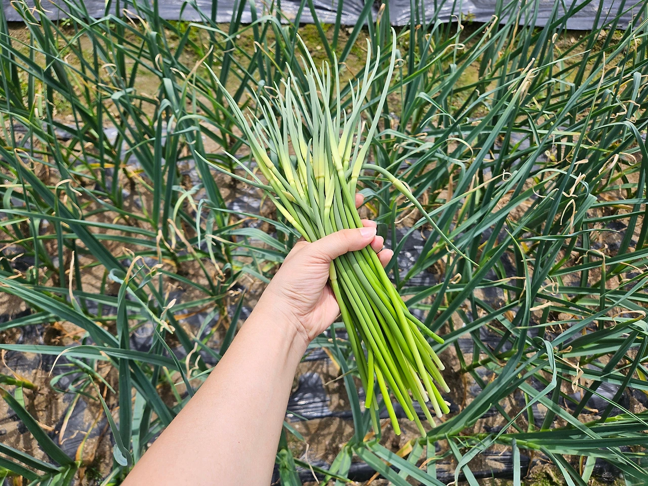 일단 장갑을 끼고 나니 엄마가 뽑는 법을 알려주셨다. 뿌리까지 뽑히지 않도록 잎 옆의 땅을 잘 밟고 마늘종을 꼭 잡아 천천히 끌어올린다. 최대한 아래쪽에서 끊겨야 길게 수확할 수 있는데 성질 급하게 잡아당기면 위에서 뚝하고 끊어져버려 먹는 부분이 짧아진다. 초보 농부는 마늘종 하나 뽑으면서도 뭐든 서두르면 안 된다는 인생사를 배운다.
