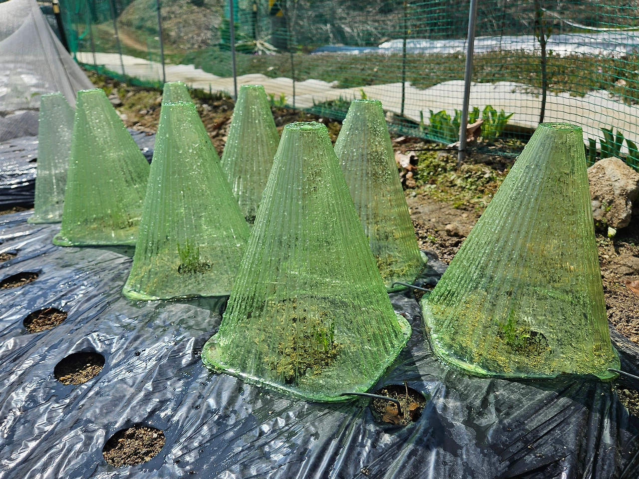 그렇게 친구들과 농사 얘기를 나누며 서로의 밭 사진을 주고받다 보면 그 안에 새로운 농사템들이 보이기도 한다. 어린 모종을 바로 밭에 심어도 될까 걱정하는 친구에게 우리 밭 공심채 사진을 보내주며 이렇게 고깔을 씌워 놓으면 된다고 했다. 이 고깔은 우리 밭에서도 올해 처음 사용하는 아이템이었다. 보통 재배하는 양이 많지 않은 도시의 텃밭 농부들은 반으로 자른 페트병을 씌워서 사용하는데 우리는 여러 개가 필요해서 고깔을 구매했다. 이 사진을 본 친구가 고깔이 갖고 싶다 얘기하는 덕에 순식간에 부러움의 대상이 되었다. 하, 이렇게 농사의 유행을 선도하는 트렌드세터가 되는 건가? 별 것도 아닌 걸로 잠시 우쭐해졌다.