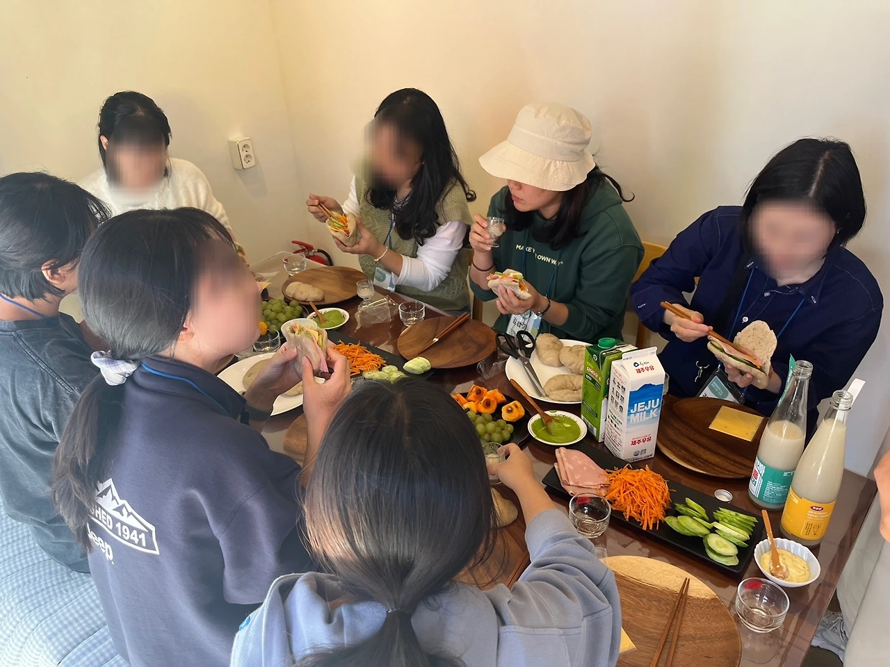 그중에서도 막걸리를 만드는 와산 언니를 만났던 날, 막걸리를 이용하여 제주의 전통빵인 상외빵을 만들어 먹는 시간이 있었다. 그리고 그렇게 만든 빵으로 샌드위치까지 만들어 먹는 것이 그날의 계획이었다. 사실 술빵의 맛을 모르는 게 아니니 만드는 동안에도 맛에는 큰 기대가 없었다. 그러나 완성된 샌드위치를 먹어보니 왠 걸, 너무 맛있다! 따끈하고 폭신한 빵이 속재료들과 잘 어우러져 너도나도 하나씩 더 먹겠다고 나섰다. 결국 준비해 주신 속재료까지 싹 비우고 왔던 기억이 있다.