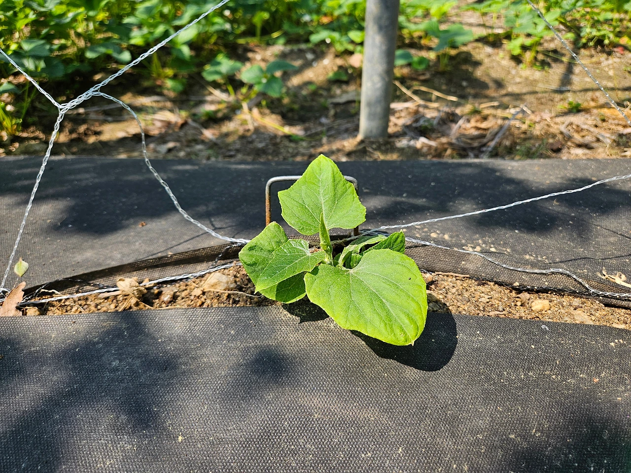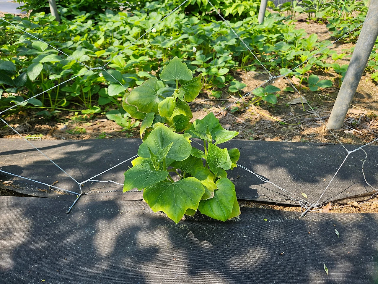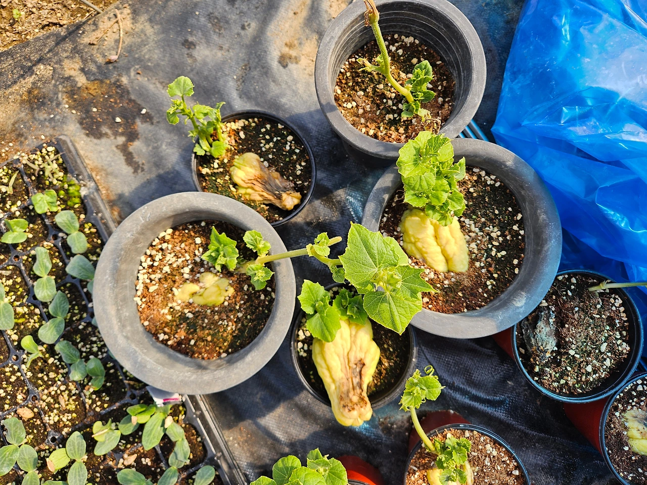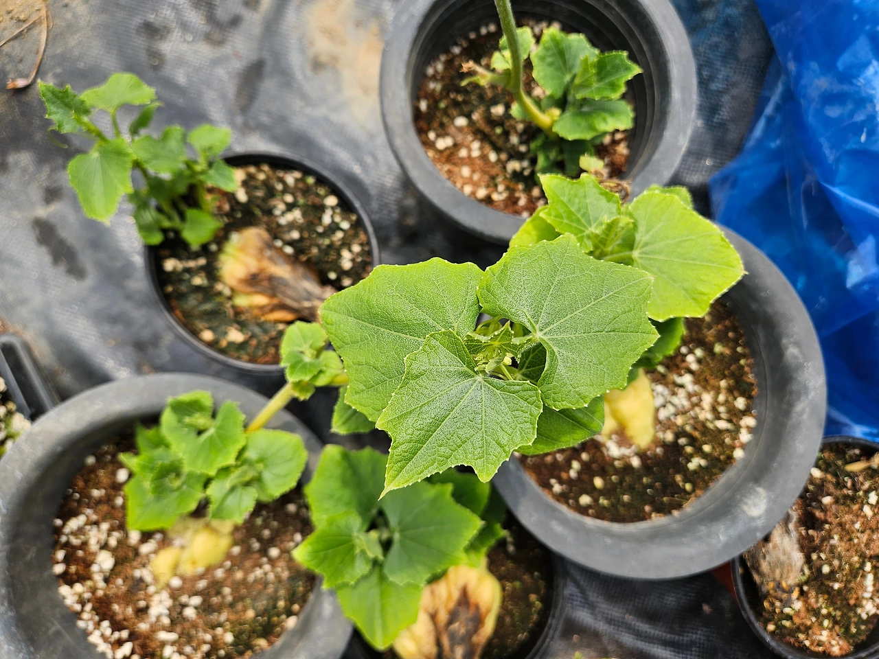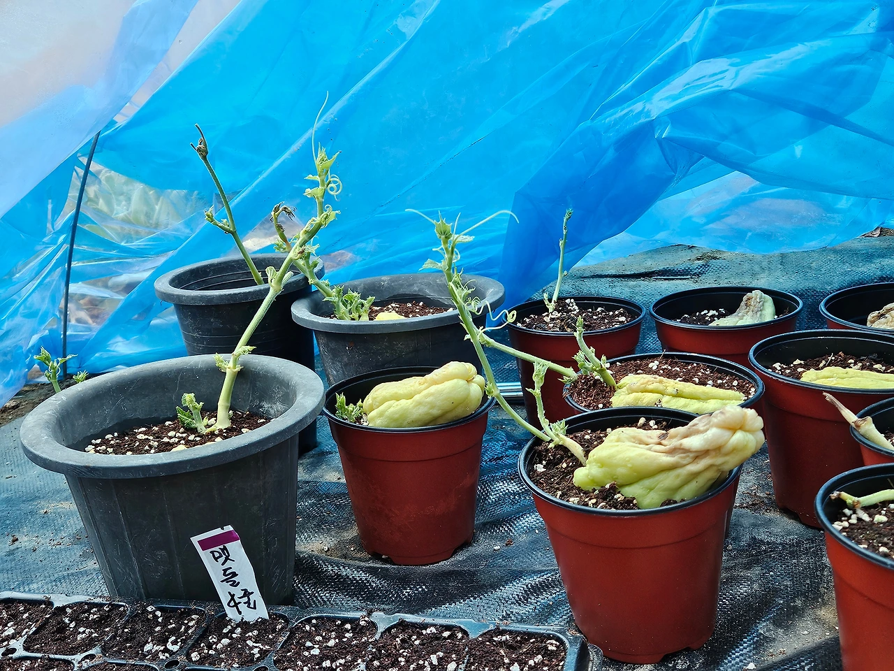 베란다에서 싹을 틔운 차요테는 밭으로 가져가 한 화분에 하나씩 심어준다. 가림막이 없는 노지에 아주 심기 전에 하우스 안에서 뿌리를 내리고 더 튼튼하게 자리 잡기를 기다린다. 이때 어떤 화분의 열매는 밭에 옮겨 심을 때까지 건강하고, 어떤 열매는 삭아서 쪼그라든다. 쪼그라든 열매가 있는 화분은 잘 못 크는 거 아닌가 걱정했는데 싹에서 나온 뿌리가 흙에 잘 자리 잡으면 다행히 크는 데 문제없었다.
