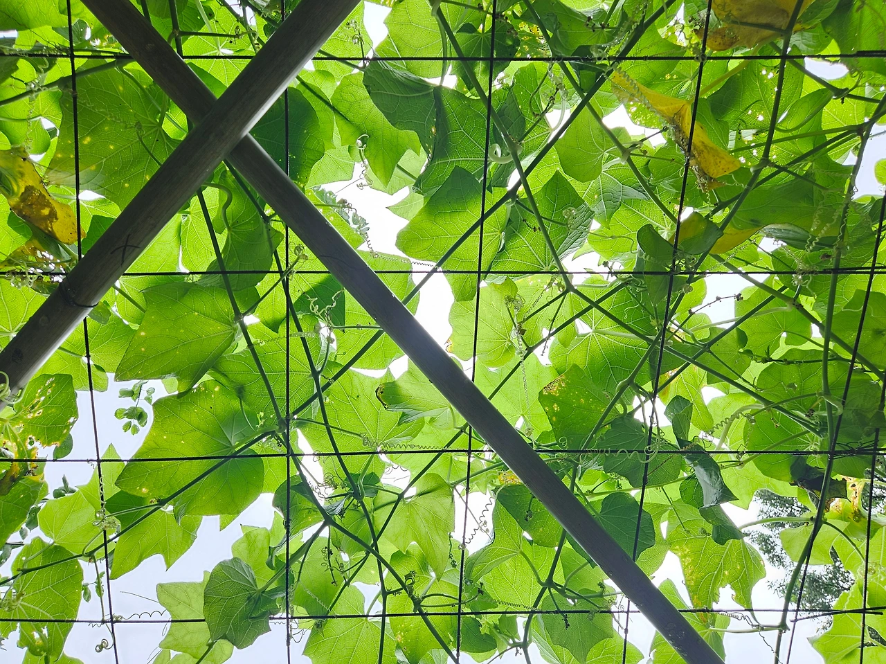 모종이 튼튼하게 자라고, 따뜻한 나라에서 자라는 차요테가 추위로 인한 피해를 입지 않을 만큼 날이 풀리면 밭으로 옮겨 심는다. 앞서 말했듯이 박과 작물, 덩굴성 채소기 때문에 타고 올라갈 것을 만들어줘야 한다. 우리 밭에서는 지지대를 이용하여 틀을 잡고 그 위에 그물망을 덮어 터널을 만들었다. 처음 옮겨 심고 나서는 얘가 언제 자라서 이 터널을 다 덮나 싶었다. 그리고 한참을 지켜보는데 왜 이렇게 안 크는 거지? 변화가 있어야 사진을 찍고 기록해 둘 텐데 몇 번을 가서 봐도 그대로인 것 같았다. 뭐가 잘못된 건가 싶었는데 찾아보니 실제로 생육기간이 긴 채소였다. (180~200일) 5월에도 자그마해서 걱정을 시키던 차요테는 7월이 되어도 겨우 터널 천장에 닿을 만큼 자랐다. 괜히 마음이 조급해졌지만 그럴 때마다 '그래, 얘 아열대 작물이지.' 하면서 마음을 진정시켰다. 8월이 되니 드디어 천장을 다 덮었다. 또 느꼈다. '그래, 얘 아열대 작물이지.' 야무지게 잡고 올라가는 덩굴손도 기특하고, 터널 안에서 올려다본 하늘도 예뻐서 괜히 한 번씩 몸을 굽히고 들어가서 구경하고 나오고는 했다.