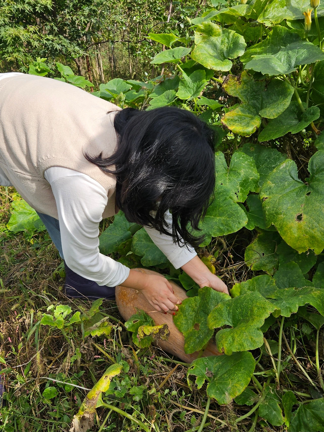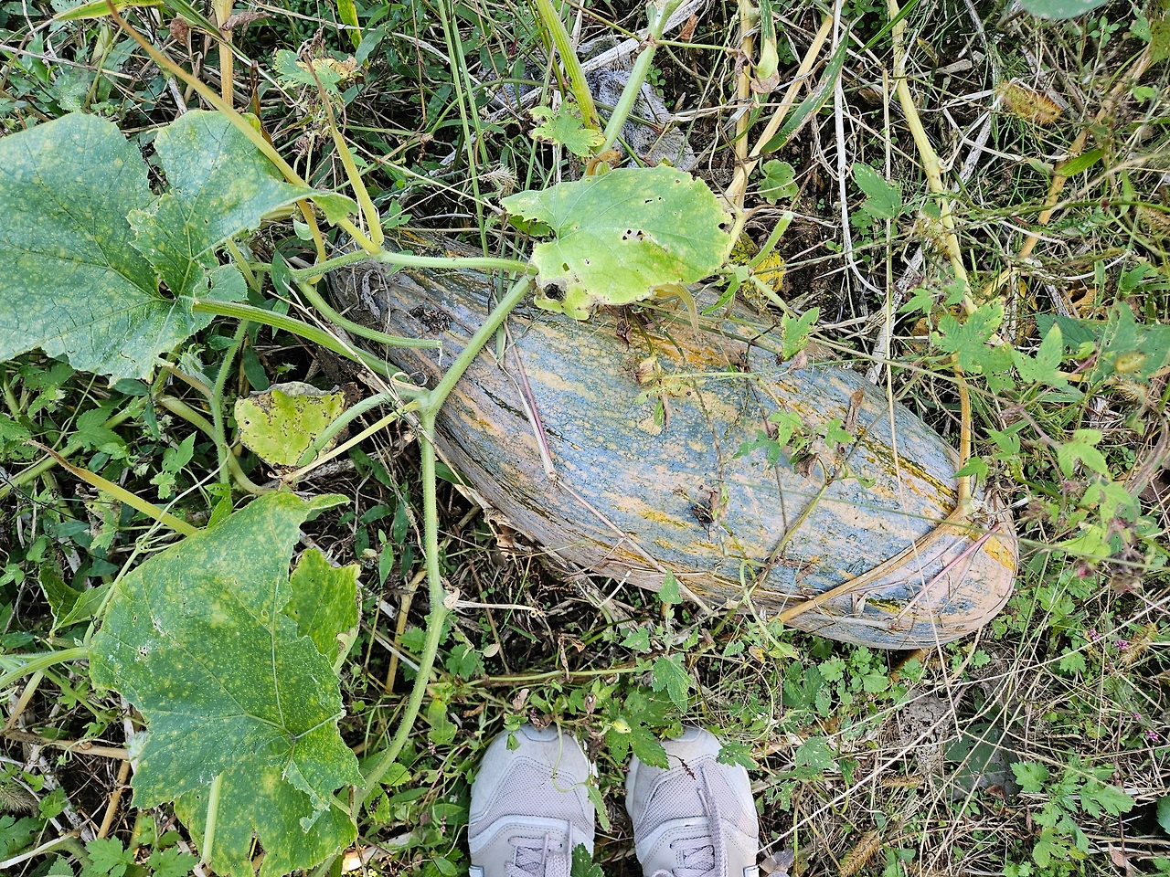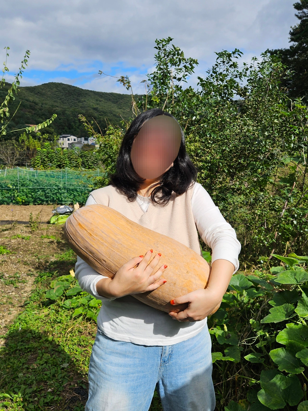 올해는 평소 보던 것과 다른 신기한 호박도 만났다. 우리 밭을 기준으로 윗 밭, 옆 밭으로 부르는 이웃들이 있는데 종종 이 분들과 씨앗을 주고받기도 한다. 이것도 옆 밭에서 주신 씨앗을 심어 기른 것이라고 했다. 크는 동안 길쭉한 모양도 특별하다 생각했지만 무엇보다 시간이 지날수록 어마어마하게 크게 자라났다. 이 호박을 보고 있으면 마치 내가 소인국 사람이 된 것 같은 기분이었다. 이렇게 큰 호박이 있을 수 있구나 하며 이름을 물었더니 토종 호박이라고 부른다고 했다.