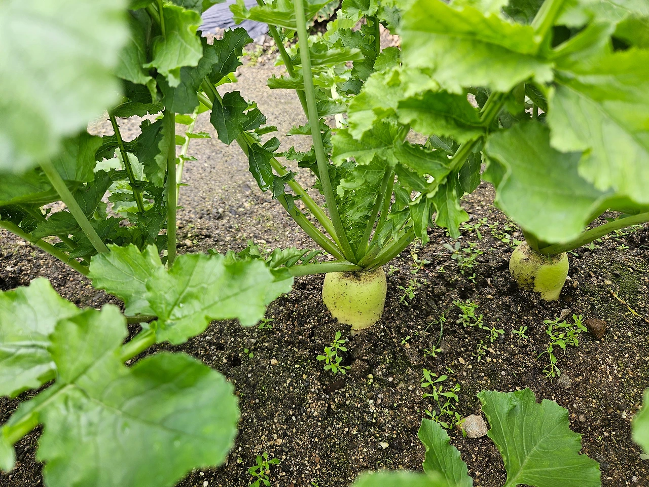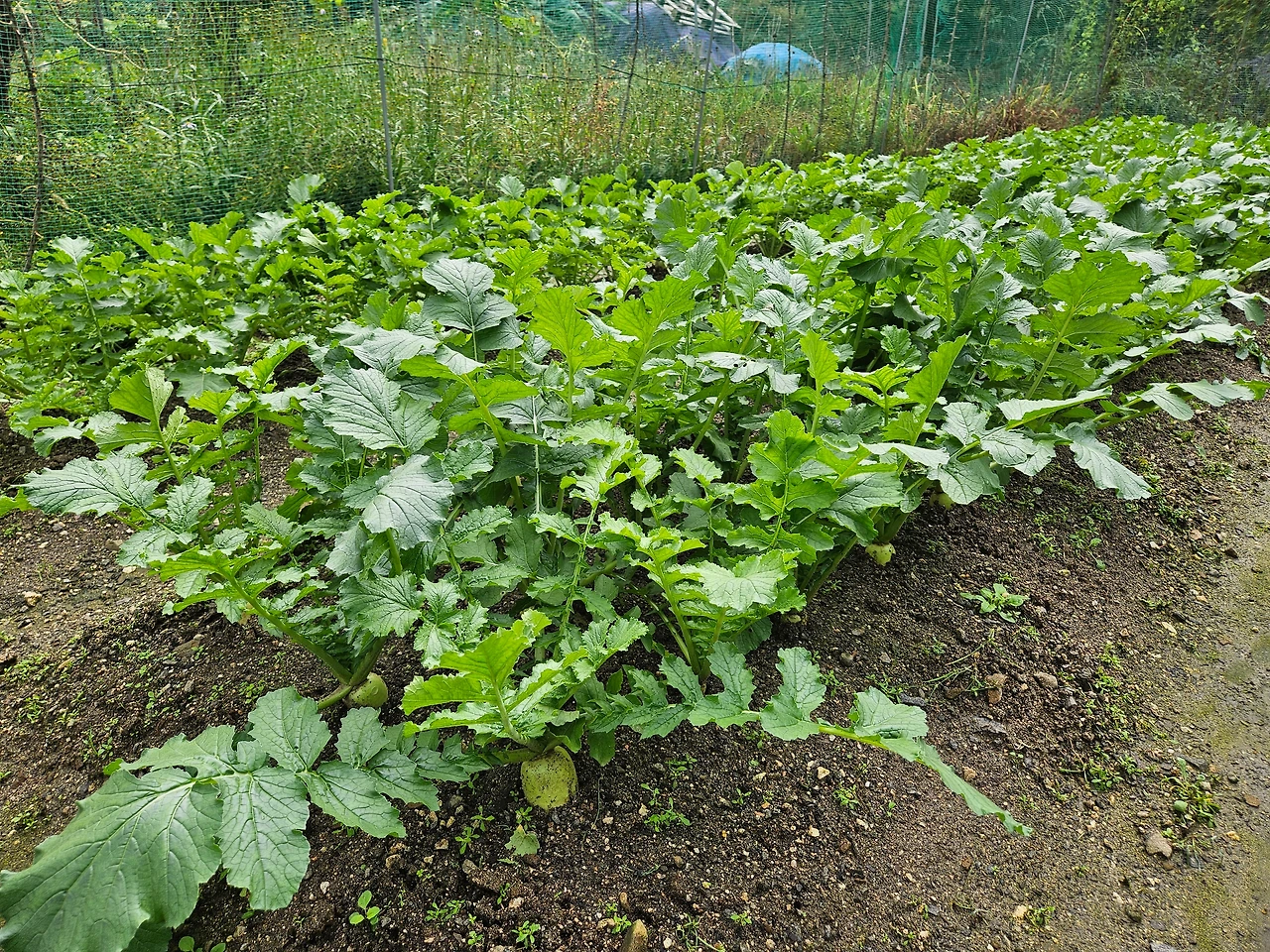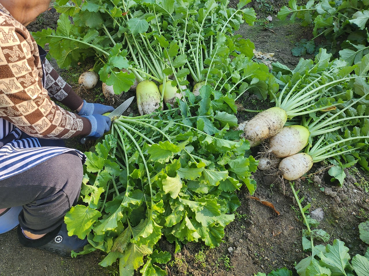 이제 모든 농사가 끝났기 때문에 절기에 맞춰 채소를 수확하고 이를 글로 옮기는 일도 끝에 다다랐다. 마지막으로 수확한 채소는 무였다. 대부분은 배추와 함께 수확해서 김장하는데 썼지만 아직 작아서 일부 남겨둔 무는 이후에 수확했다. 다시 무 씨앗을 심던 날로 돌아가면 8월 말, 여름의 끝자락이었다. 두 번째 파종이었다. 여름은 심고 자라는 게 많아서 새로운 채소를 심을 자리가 모자라기도 한다. 1차로 빈 땅에 심고, 일주일 뒤 참외와 수박을 정리한 자리에 심었다. 무와 당근 같은 뿌리채소는 장소를 옮기면 다시 자리 잡고 자라는 게 어렵기 때문에 밭에 바로 씨앗을 뿌린다. 와이어가 묶여있는 말뚝을 하나씩 나눠 들고 밭의 끝과 끝에 섰다. 나란히 비뚤어지지 않게 붙잡고 말뚝을 박는다. 곧게 뻗은 와이어를 따라가며 구멍을 파서 한 구멍에 씨앗을 5개씩 심었다. 씨앗 봉투를 자세히 들여다보면 발아율이라는 게 적혀있다. 나중에는 한 구멍에 하나만 잘 키워야 크고 건강한 무로 자라나지만 씨앗을 심는다고 100% 발아하는 게 아니기 때문에 여러 개를 심고 나중에 솎아준다.