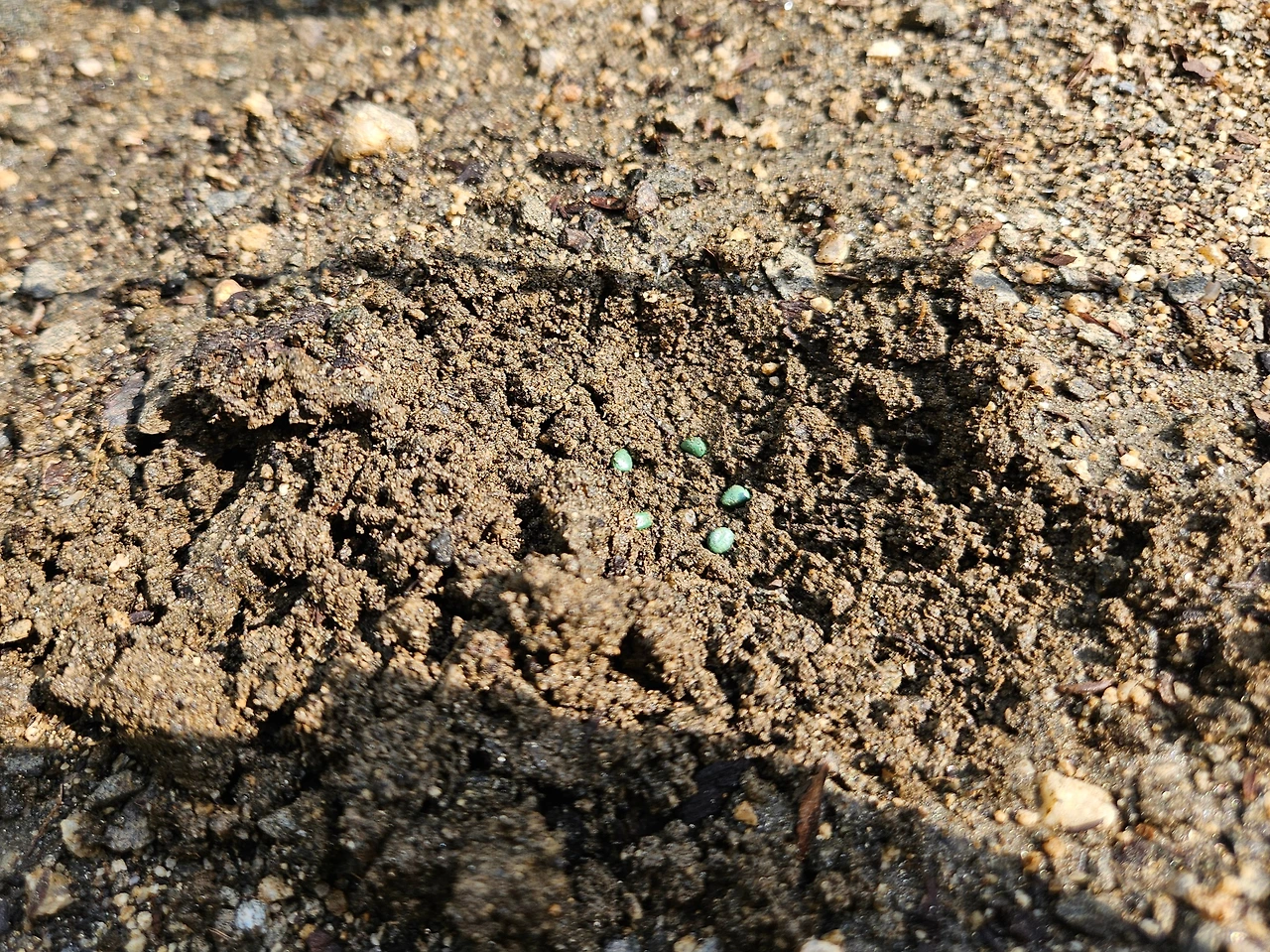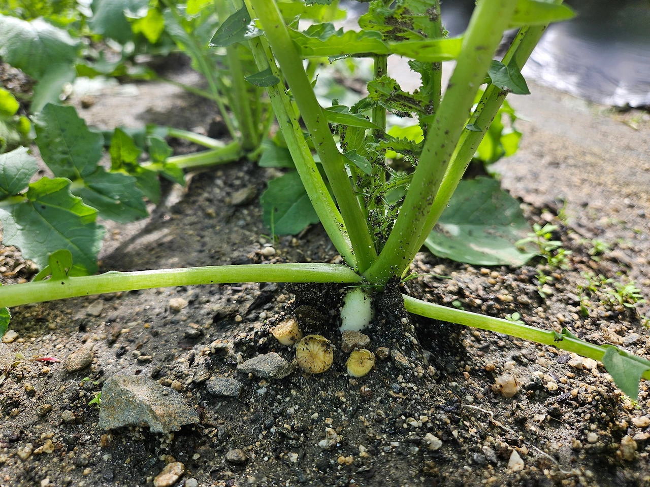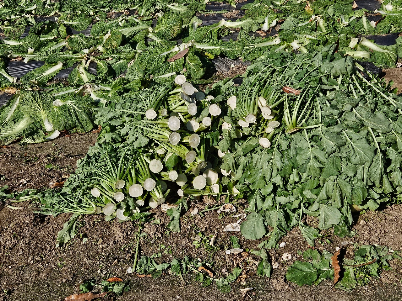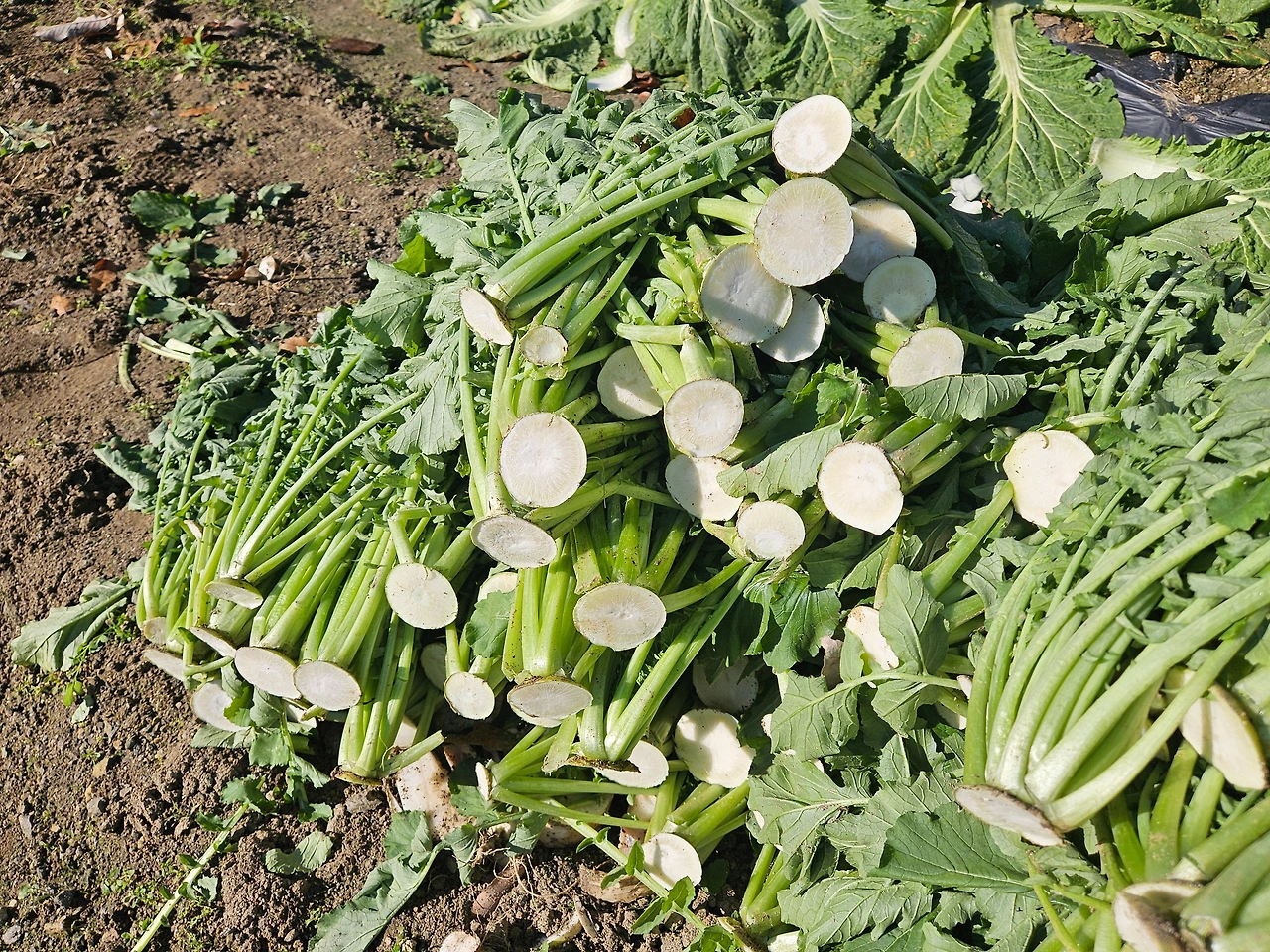 이제 모든 농사가 끝났기 때문에 절기에 맞춰 채소를 수확하고 이를 글로 옮기는 일도 끝에 다다랐다. 마지막으로 수확한 채소는 무였다. 대부분은 배추와 함께 수확해서 김장하는데 썼지만 아직 작아서 일부 남겨둔 무는 이후에 수확했다. 다시 무 씨앗을 심던 날로 돌아가면 8월 말, 여름의 끝자락이었다. 두 번째 파종이었다. 여름은 심고 자라는 게 많아서 새로운 채소를 심을 자리가 모자라기도 한다. 1차로 빈 땅에 심고, 일주일 뒤 참외와 수박을 정리한 자리에 심었다. 무와 당근 같은 뿌리채소는 장소를 옮기면 다시 자리 잡고 자라는 게 어렵기 때문에 밭에 바로 씨앗을 뿌린다. 와이어가 묶여있는 말뚝을 하나씩 나눠 들고 밭의 끝과 끝에 섰다. 나란히 비뚤어지지 않게 붙잡고 말뚝을 박는다. 곧게 뻗은 와이어를 따라가며 구멍을 파서 한 구멍에 씨앗을 5개씩 심었다. 씨앗 봉투를 자세히 들여다보면 발아율이라는 게 적혀있다. 나중에는 한 구멍에 하나만 잘 키워야 크고 건강한 무로 자라나지만 씨앗을 심는다고 100% 발아하는 게 아니기 때문에 여러 개를 심고 나중에 솎아준다.