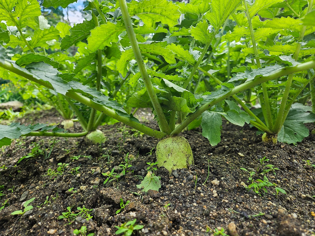 무는 하루가 다르게 자란다. 얼마나 자랐는지 보러 가서 고개를 숙여 땅 가까이를 들여다보면 조금씩 땅 위로 내민 얼굴을 볼 수 있다. 이렇게 땅 위로 올라온 부분이 햇빛을 받아 녹색으로 물든다.