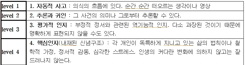 -자기 장래 : 그래서 내 미래도 우울하고 참담해. 가망이 없어. 변화가 없어. 더 나빠질거야. 라는 신념에 산다. 신념이 깔려 있기 때문에 오토매틱으로 나온다.