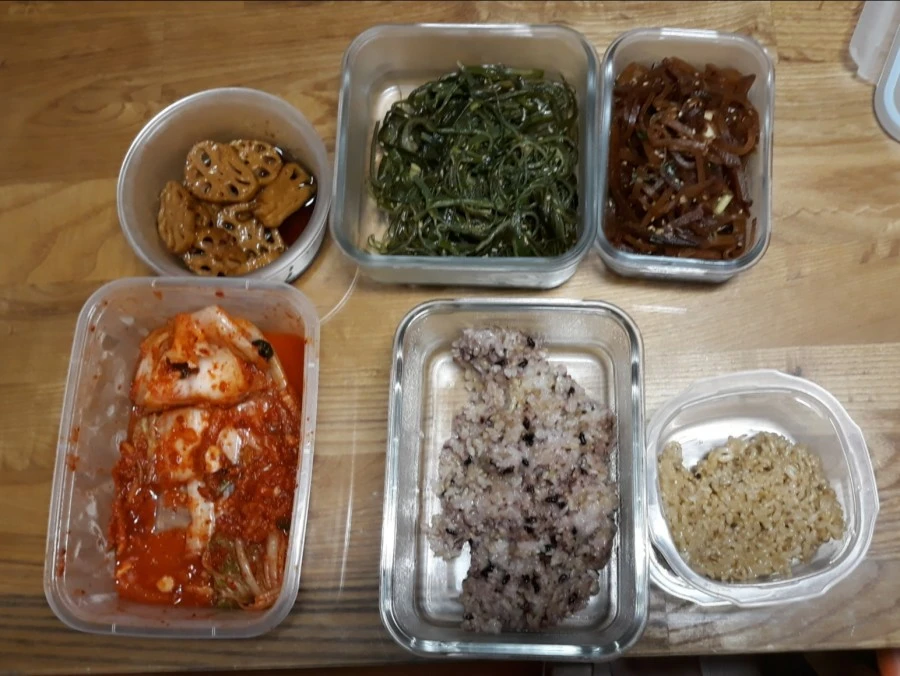 오후 09:50 현미밥, 흑미밥, 배추김치, 연근조림, 미역 줄거리 볶음, 무장아찌