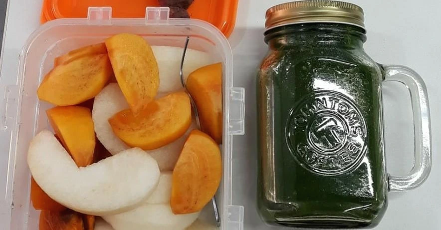 오전 07:00 홍시 1개. 바나나 1개, 배 1조각, 아몬드 12개