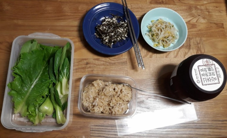 오후 08:30 ~ 09:00 현미쌀밥 3그릇, 고추장, 톳두부무침, 숙주나물무침, 청경채와 상추