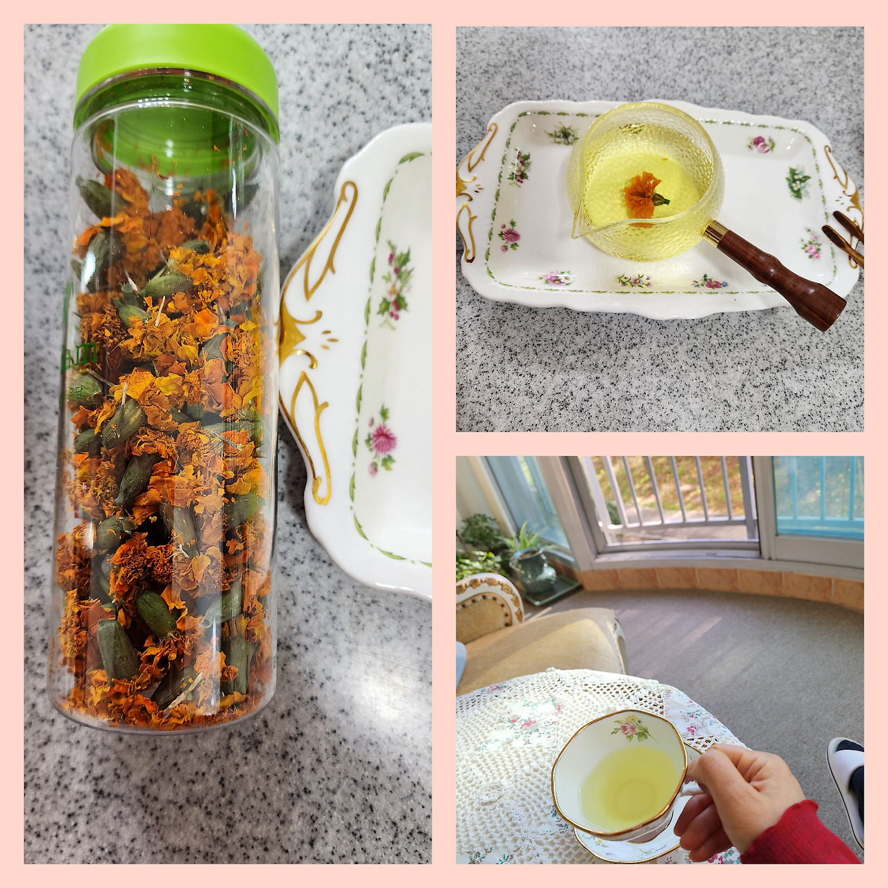 루테인과 지아잔틴 함량이 풍부한 메리골드는 눈에 좋은 차로 알려져있다. 점막을 보호하는 영양소의 함유로 안구건조증상을 개선하기 때문에다. 그런데 효능은 거기서 끝나지 않는다. 몸 안의불필요한 성분들은 비우고 필요한 영양분은 채워주는 건강차이기 때문이다. 메리골드티는 부종을 예방하고 발한작용이 있어 수족 냉증과 생리불순을 개선하는 효능이 있다. 해독, 수렴, 이뇨 작용으로 피부를 보호하므로 마시고 남은 꽃을 지퍼백에 넣어 냉동실에 모았다가 입욕제로 써도 좋다.