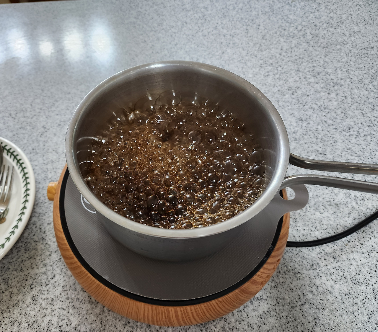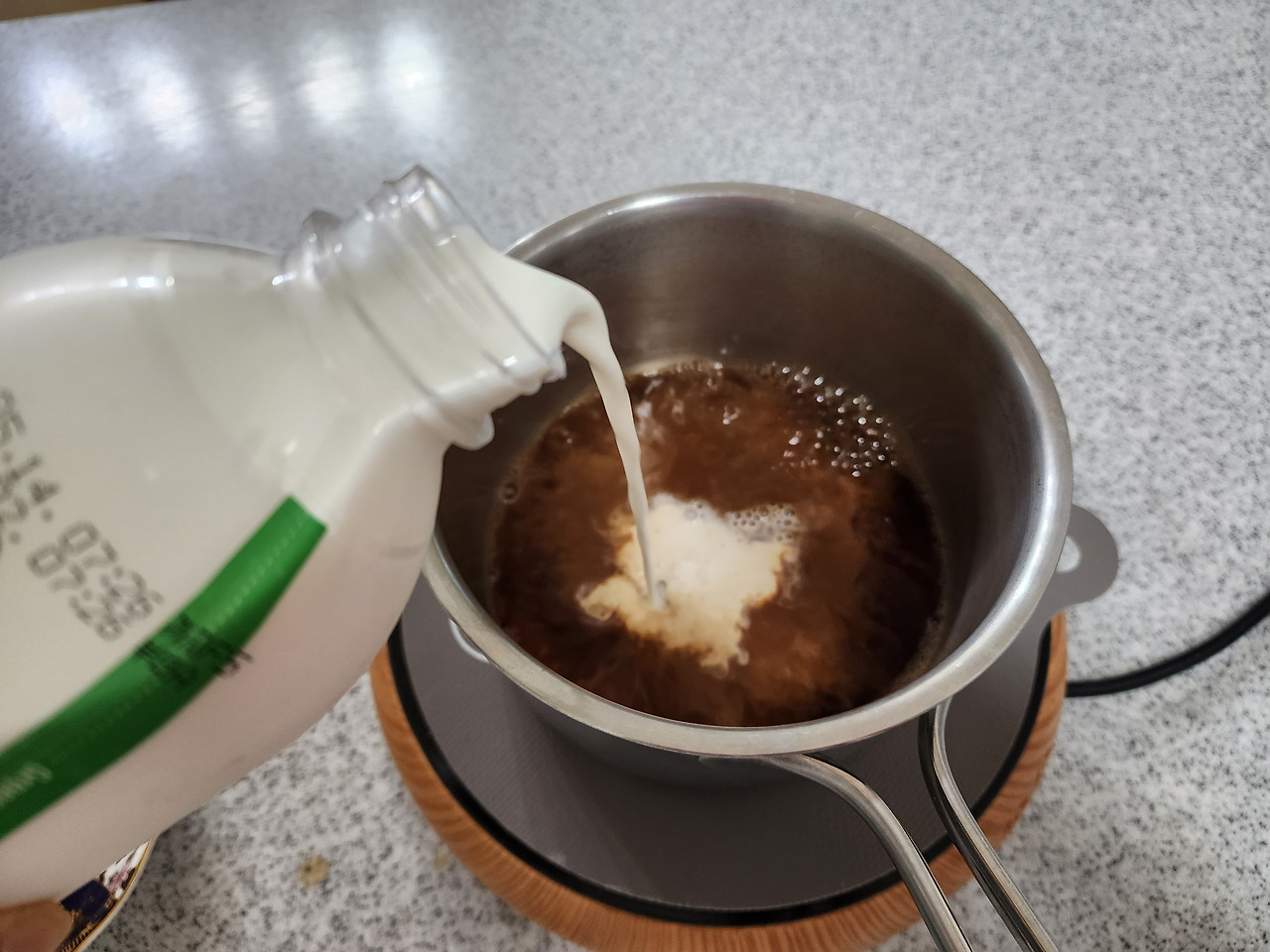 농축한 홍차가 끓어나면 우유를 넣어 기포가 올라올때까지 데운다
