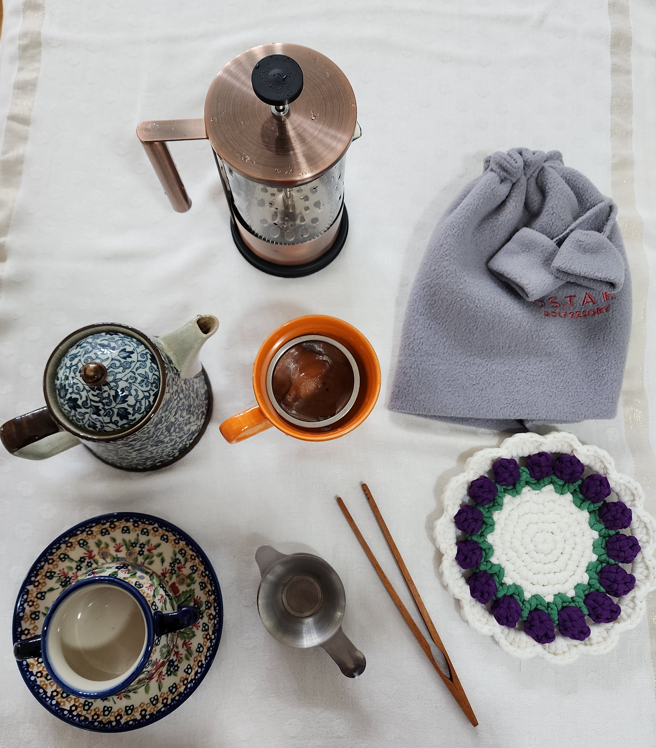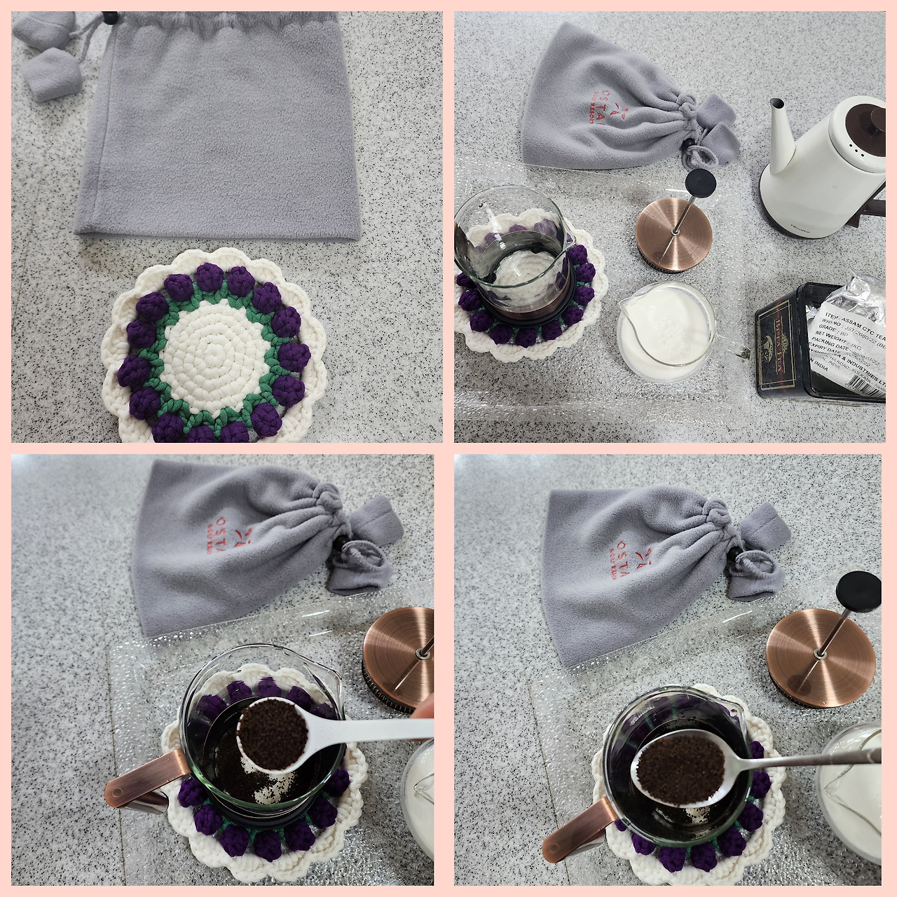 내 눈길을 붙잡은 것은 어여쁜 편물이 가지런히 걸린 숍이었다. 뜨개질을 하는 여자분의 손에 도톰하고 폭신한 실이 걸려있었다. 진열된 상품 중에 홍차를 우릴 때 받침으로 사용할 소품을 발견하고 구입했다. 여름 컬러의 감성적인 받침인데, 도톰하고 푹신해서 티 포트의 온도를 지켜줄만 했다. 홍차는 우리는 시간이 길고, 온도를 유지하는 것이 차의 침출에 도움이 되기 때문에 꼭 필요한 준비물이 포트를 덮을 수 있는 티 코지와 받침이다.