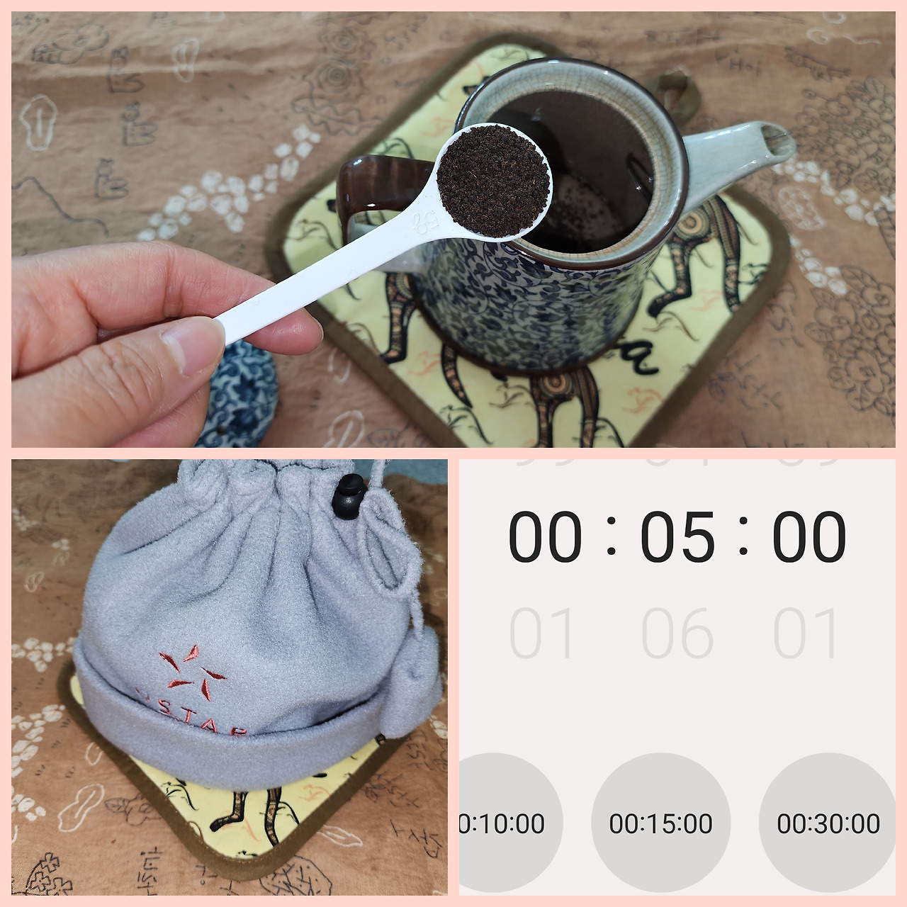 간편하게 가진 도구를 이용하면 된다, 나를 위한 힐링타임. 티 포트를 정해놓고 사용하자. 최소한의 도구를 구비하면 더 맛있고 더 즐거워진다. 신선한 물, 물을 끓일 도구, 차를 우릴 티 포트(거름망이 든 찻잔, 혹은 티메이커), 찻잎을 걸러낼 거름망, 홍차를 우리는 동안 온도를 유지시켜 줄 티 포트 받침과 티 코지 등등.
